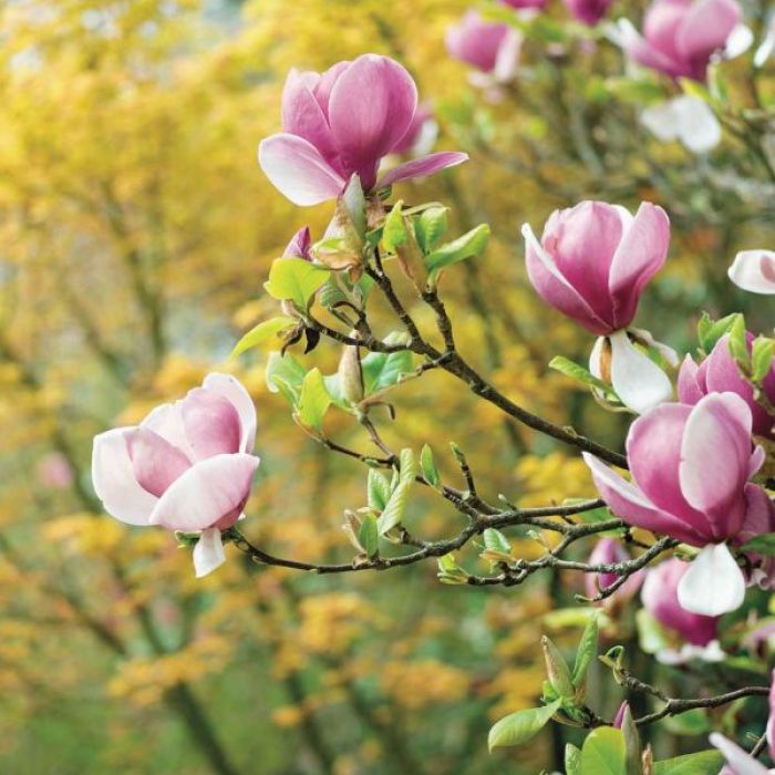 - Kolorowe krzewy kwitnące wiosną: magnolie, forsycje, wiśnie i śliwy