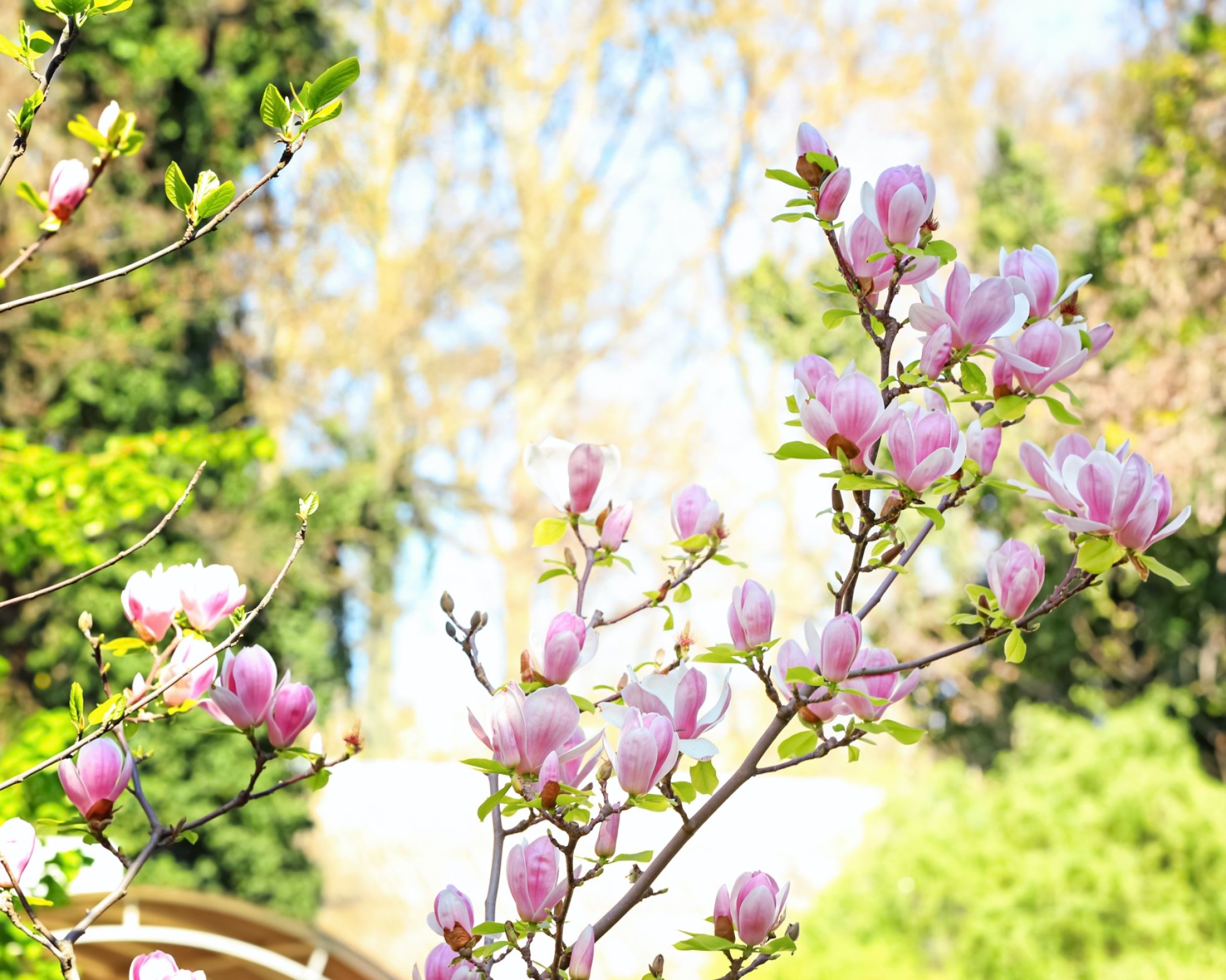 - Kolorowe krzewy kwitnące wiosną: magnolie, forsycje, wiśnie i śliwy