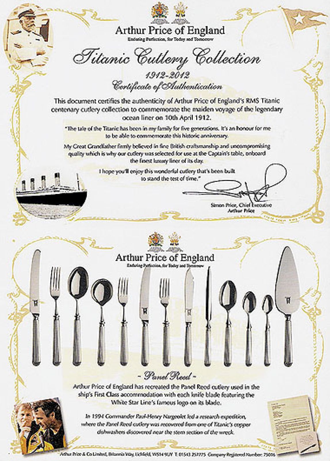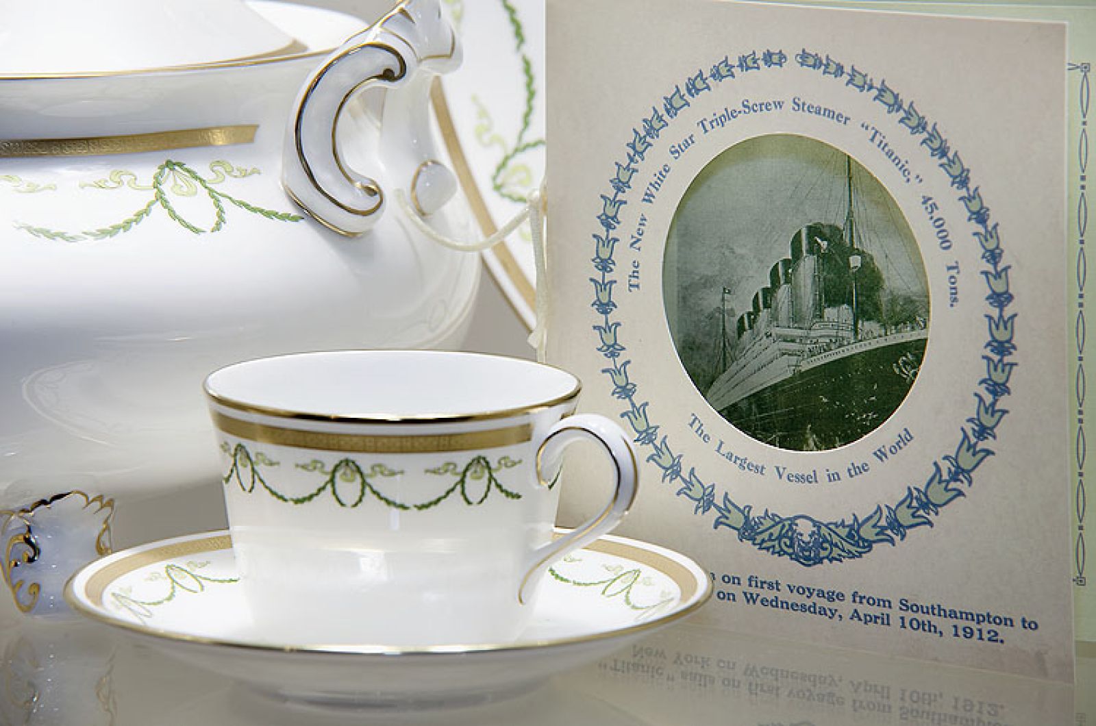 Wyprodukowała ją słynna angielska manufaktura Royal Crown Derby (działa od 250 lat) specjalnie dla gości pierwszej klasy. Rysunek na talerzach, które wydobyto z głębin, zachwyca malowanym ornamentem Chaplet and Festoons w stylu Ludwika XVI.