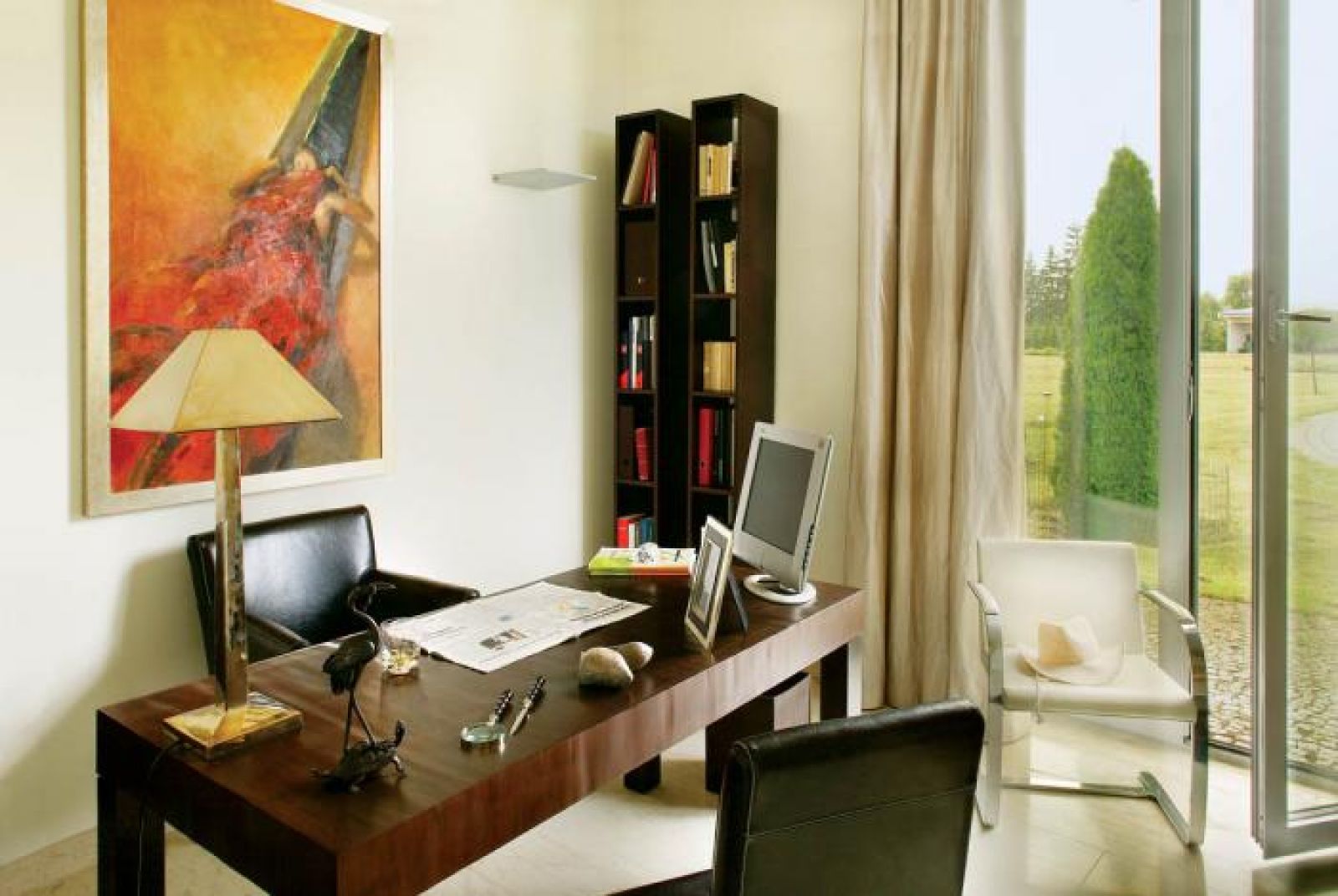 Ale w tej ascetyczności Leszek chciał mieć coś kolorowego na ścianach. Pierwszy obraz, który zwrócił jego uwagę i wisi teraz w gabinecie, wypatrzył na wernisażu Michała Zaborowskiego. Była to „Wstydliwa”. Z miejsca zamówił u artysty pięć następnych i malarz przez półtora roku pracował nad ogromnymi płótnami specjalnie do tego domu. Tak powstała „Gorąca Andaluzja w kolorach spalonej ziemi”.
