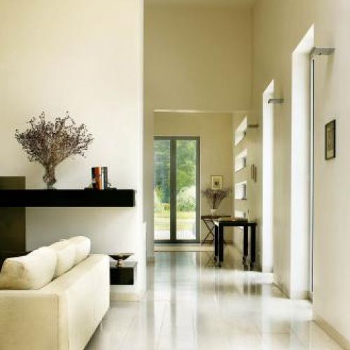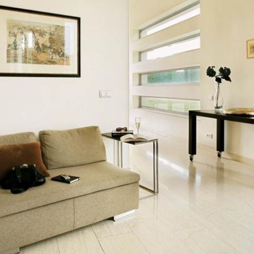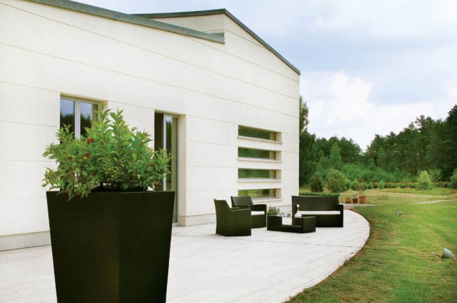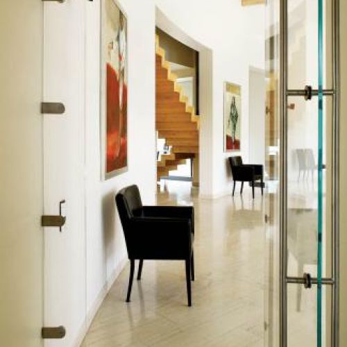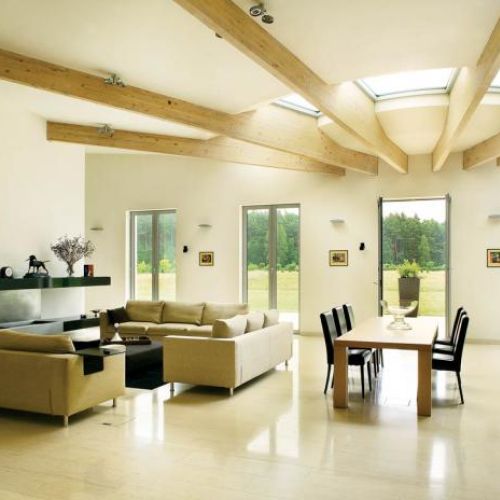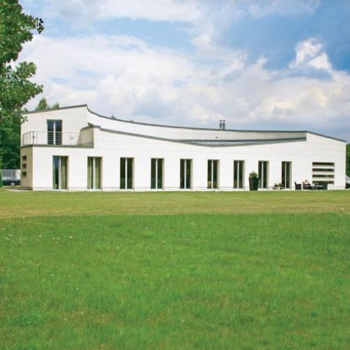 Przestronny, nowoczesny dom wymyślili architekci z warszawskiej pracowni „Spychała i Partnerzy”. Na planie półkola powstał sześćsetmetrowy gmach, który naprawdę robi wielkie wrażenie. Prawie cały (pięćset metrów) jest parterem. Piętro to tylko jeden pokój i łazienka. Na dole dwustumetrowy salon, który w najwyższym punkcie ma siedem metrów, a w najniższym cztery i pół. Ogromne okna bez zasłon sprawiają, że dom wydaje się jeszcze większy.