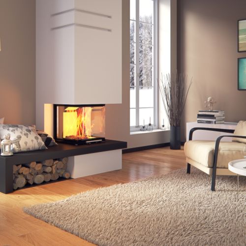 To pierwszy taki wkład kominkowy polskiej produkcji - z drzwiami bezramowymi trójstronnymi, otwieranymi do góry. Wymiary drzwi: 470 mm szerokości, 470 mm głębokości, 510 mm wysokości. To idealny wkład kominkowy o pięknej wizji ognia z trzech stron w kompaktowym wymiarze. Eleganckię zapewnia reling ze stali szczotkowanej. Moc nominalna: 7,5 kW.