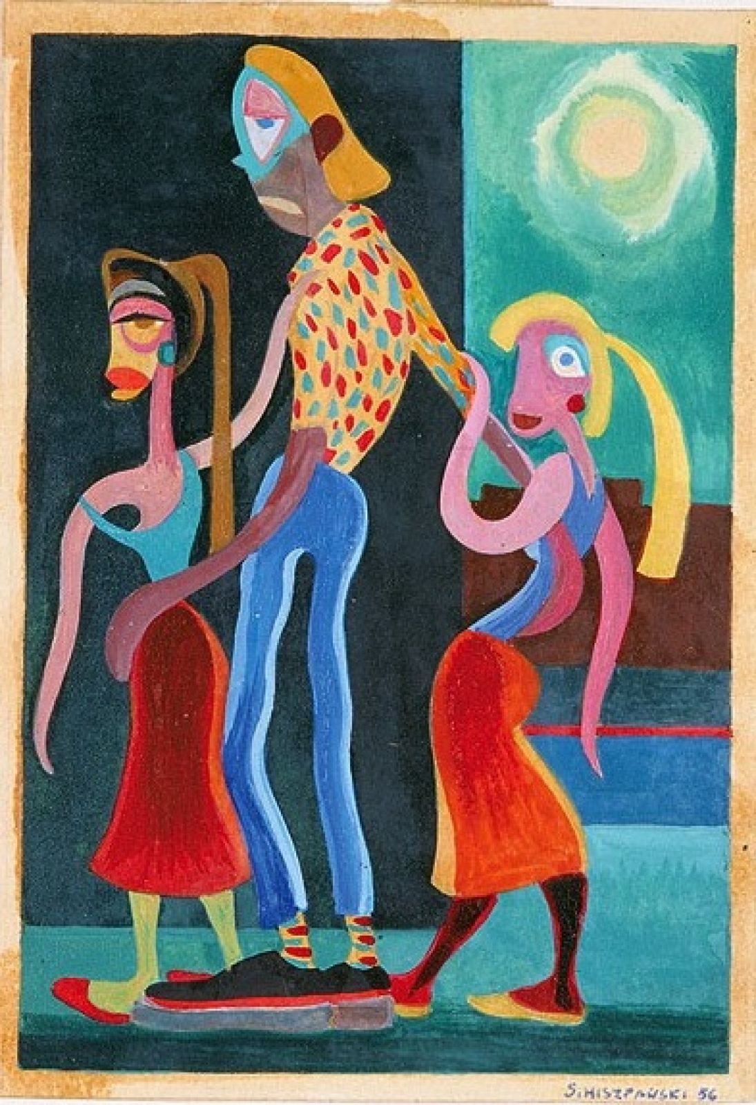 Stolik fornirowany, na fantazyjnie wygiętych nogach. Nieduży fotel dopełnia kompletu. – O, tak na nim siedział, gdy malował – Bogna Hiszpańska przysiada na samym skraju mebla. Niezbyt wygodna pozycja i aż trudno uwierzyć, że to właśnie tutaj powstały setki prac Stanisława Hiszpańskiego. Sam śmiał się, że niewielki rozmiar jego obrazów to sprawa życiowej konieczności – całe lata przemieszkał z rodziną w jednopokojowym mieszkaniu. Nie było miejsca na pracownię, więc tworzył na stole.
