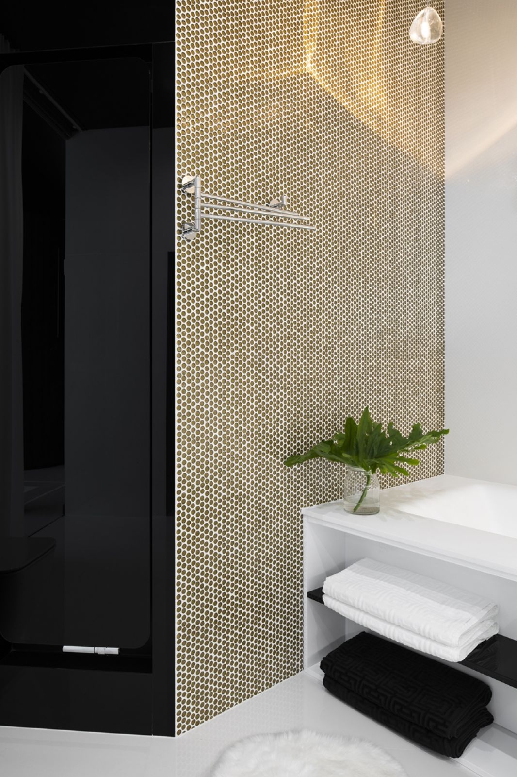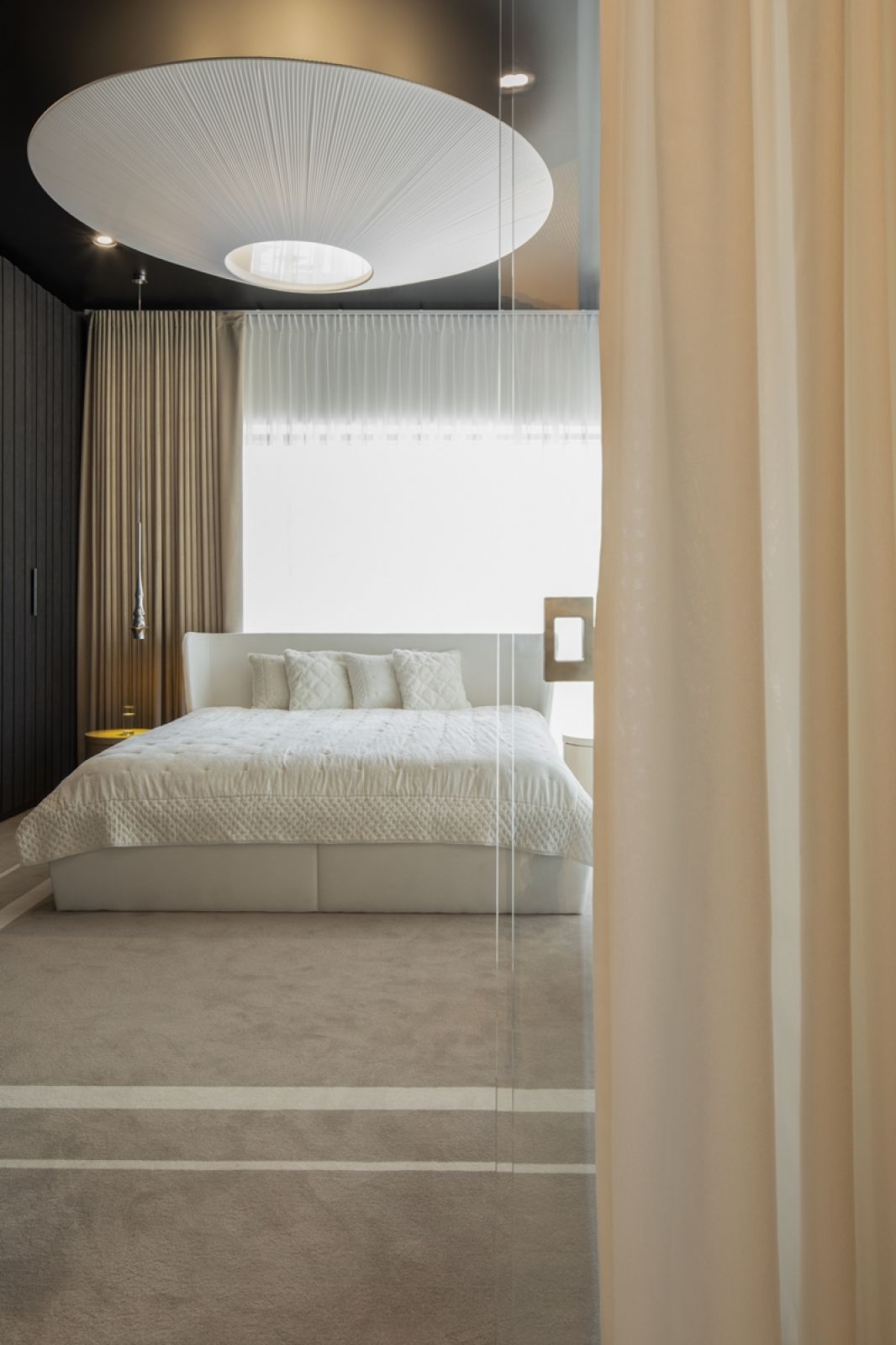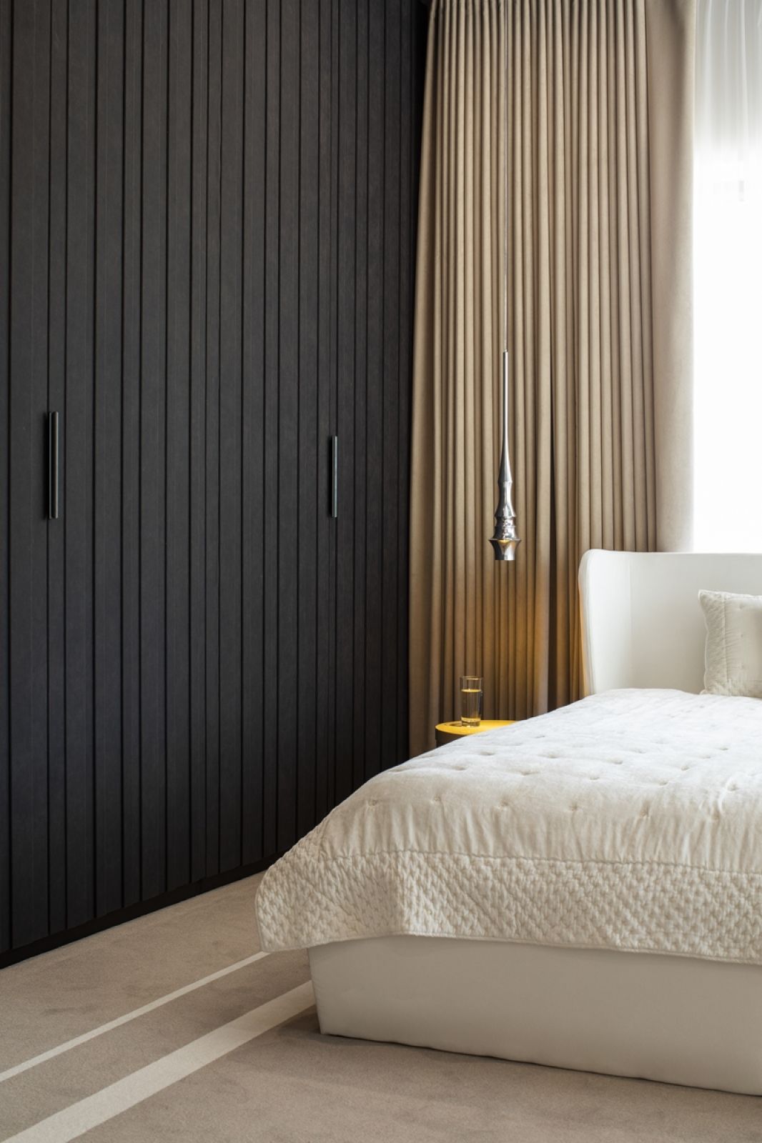 Czarne są też zasłony, jedwab pokrywający ściany w sypialni oraz fragmenty sufitów. Duże połacie tej mocnej barwy nie przytłaczają, wręcz przeciwnie – równoważą biele, beże i szarości, łagodzą blask złotych i szklanych dodatków. Fałdy zasłon „korespondują” z fakturą tkanin na ścianach i drzwiach szaf. Posadzki z jednolitego drewna sąsiadują z taflami marmuru na podłogach. „Lambrekin” umieszczonych pod sufitem świateł staje się pełnoprawnym wyznacznikiem podziału wnętrza. Ściany, podłogi, sufity tworzą przemyślaną, intrygującą całość. Można powiedzieć, że w projekcie tego wnętrza najważniejsza jest właśnie architektura wnętrz.