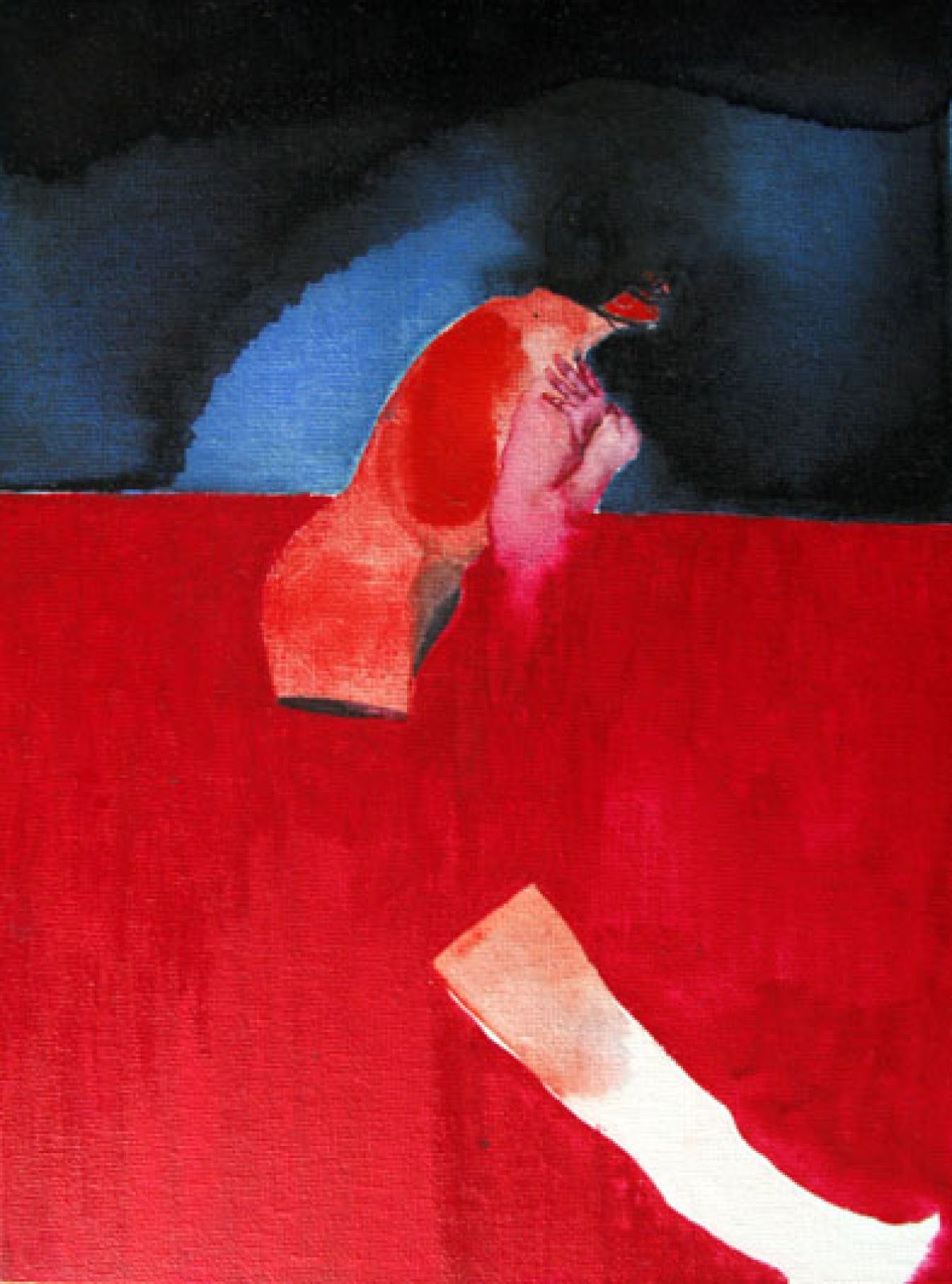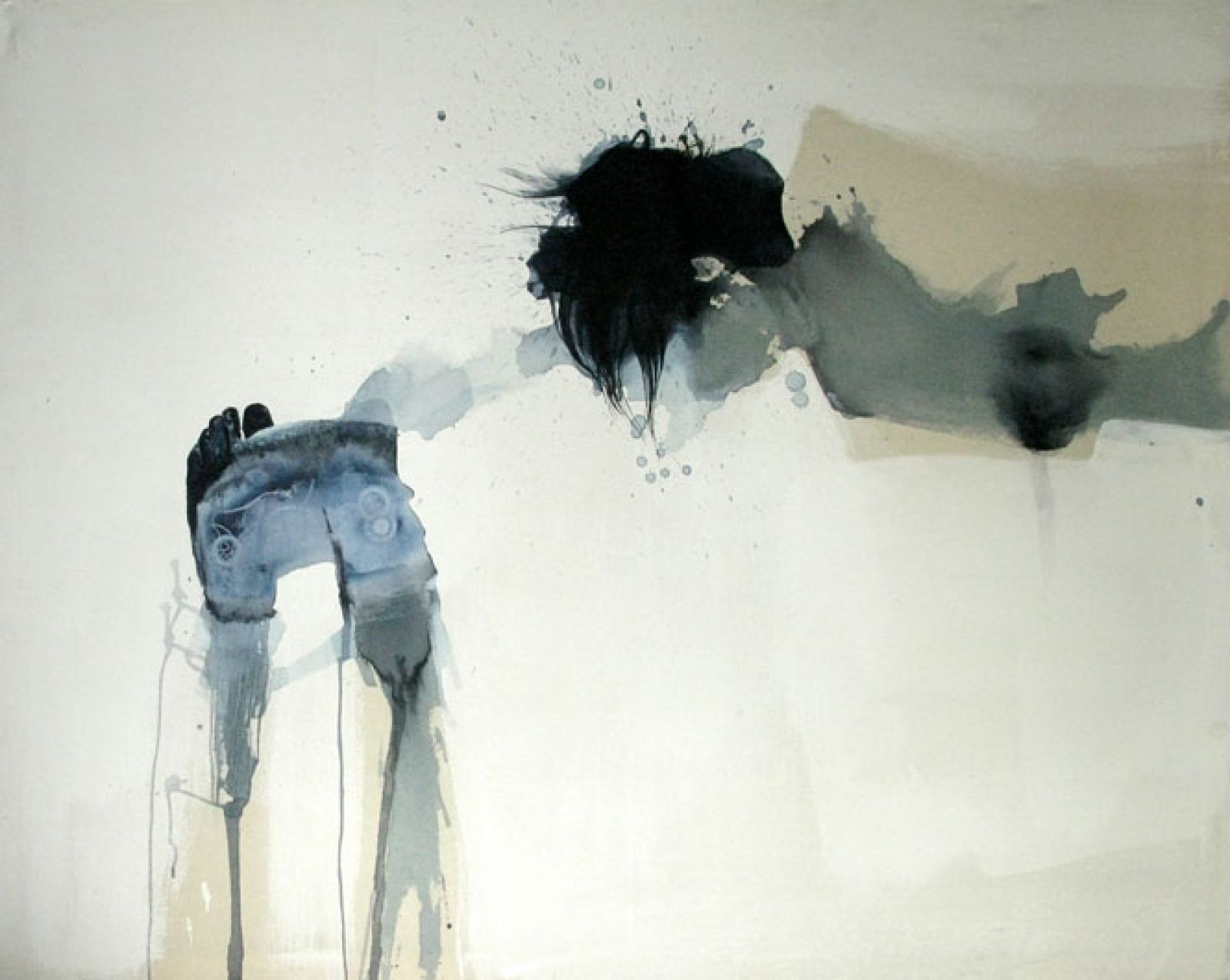 Monika Smyła to przeciwny biegun - kariera dopiero przed nią, ale już teraz zachwyca lirycznymi akwarelami, na których zlewa się z tłem, traci granice, tonie w mroku. Skupiona na sobie, skulona lub zatopiona wyłania się z rozlanej plamy. Ta kolejność jest nieprzypadkowa - autorka najpierw zanurza się w delikatną materię akwareli by z niej budować postać. Tworzy niewielkie akwarele, ale potrafi zaskoczyć dużymi płótnami. W jej powiększeniach akwarela zachowuje spontaniczność gestu i intensywność barwy, a typowe dla tej techniki rozlania nabierają organicznego charakteru. Duże kompozycje to bardzo dynamiczne, wręcz dramatyczne obrazy, w których napięcie osiągnięte siłą gestu przywołuje sztukę japońskiej kaligrafii. Smyła zaprasza do swojego świata, pokazuje w intymnych sytuacjach, ale utrzymuje dystans. Do siebie też.
