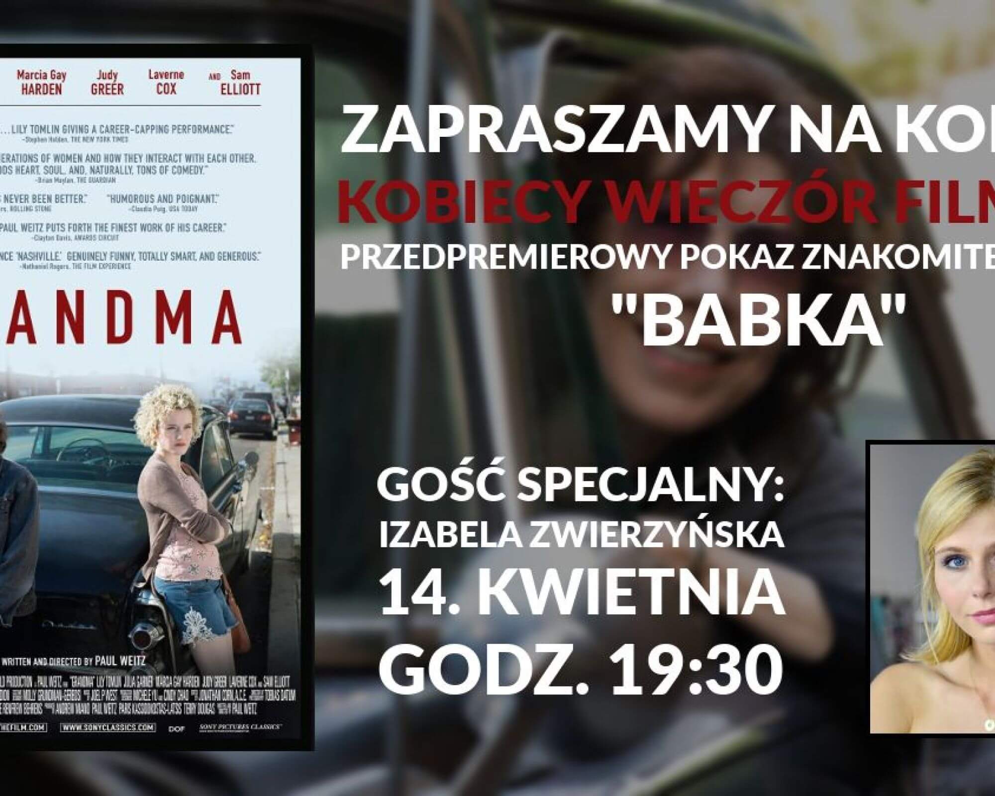 14 kwietnia o godzinie 19:30 zapraszamy wszystkie Panie na filmowe powitanie wiosny, czyli przedpremierowy pokaz znakomitej komedii „Babka” w warszawskiej Kinotece. Kobiecy Wieczór Filmowy jest popularnym cyklem spotkań w kobiecym gronie, podczas których nie brakuje rozmaitych atrakcji i niespodzianek. Głównym punktem Kobiecych Wieczorów Filmowych jest projekcja – często przedpremierowa – ambitnych filmów. Na najbliższym spotkaniu będzie to komedia „Babka