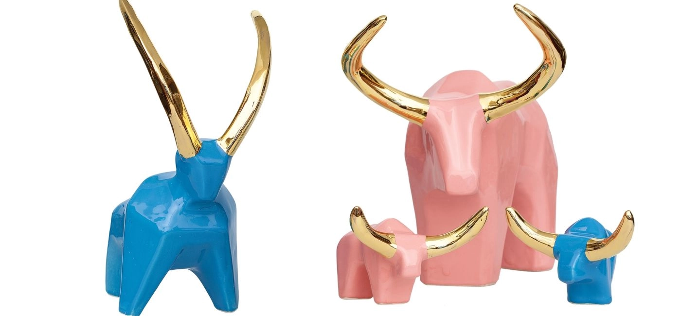 Zdjęcie główne: „Koziorożec”, 2020 r. oraz „Krowa Ankole-Watussi, wersja mała i micro”, 2019 r., niżej: „Zebra Mała”, 2018 r.