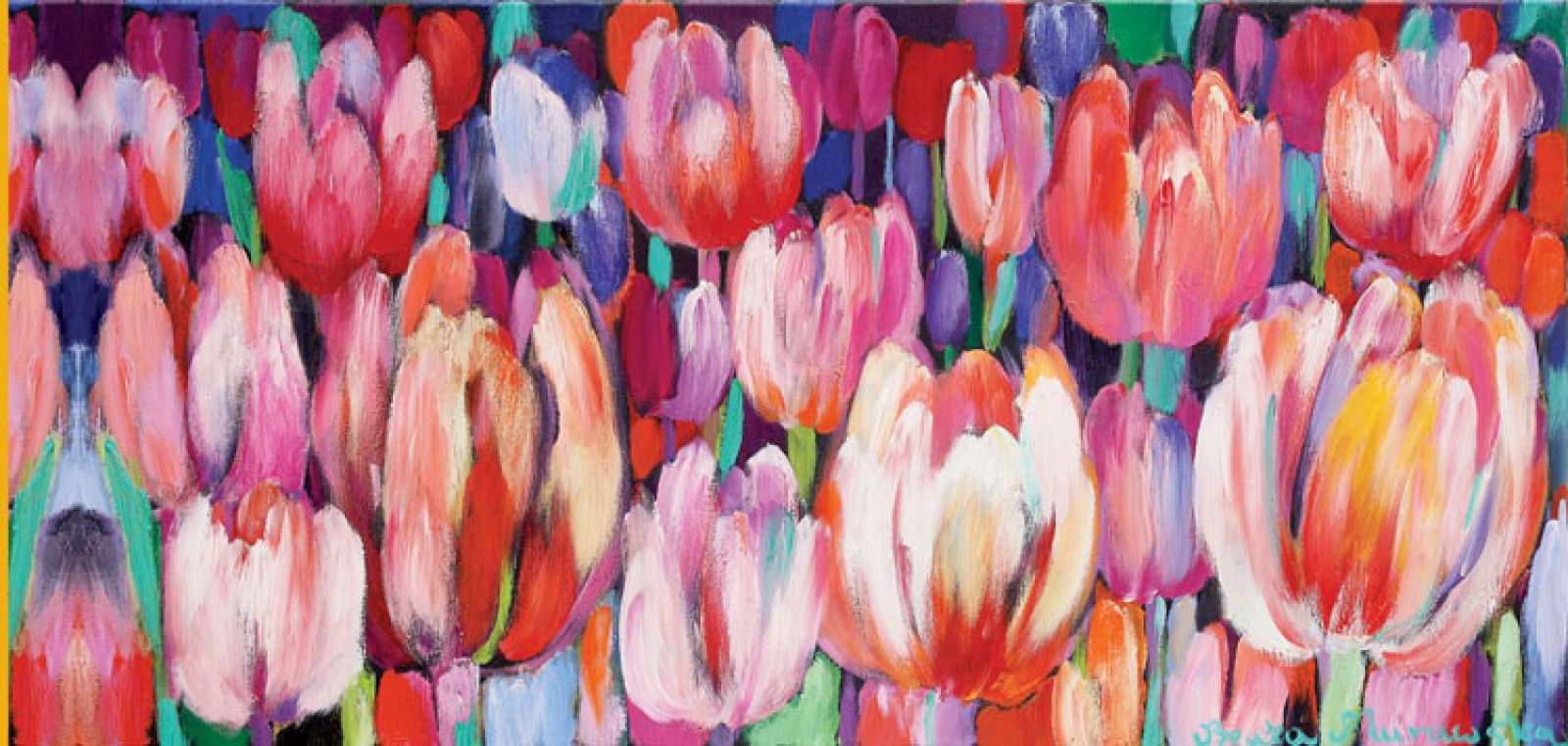Za to Beata Murawska ma się dobrze i jej tulipany również. Porastają całe połacie płócien, w odcieniach prawdziwych i fikcyjnych.