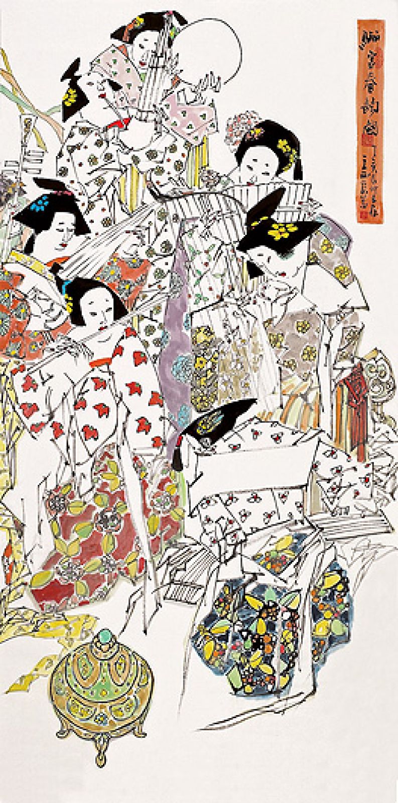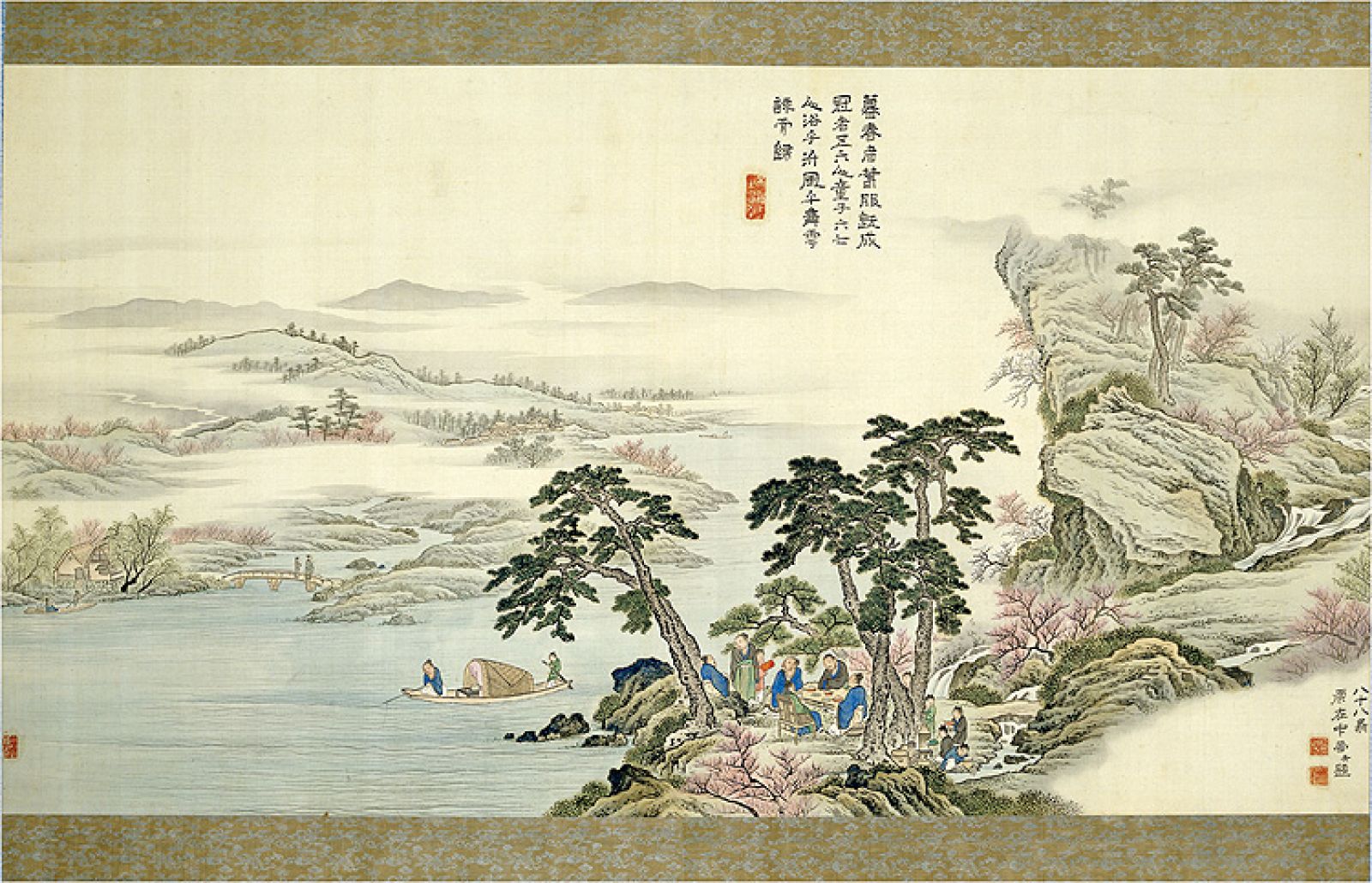No i pejzaże. Z ulubionymi górami i wodą, nieraz z zarysem wioski i malutkiego człowieka. Wilgotne, mgliste i magiczne. Zobaczymy na nich księżyc, ale słońca nigdy. Powód? Chińscy malarze nie znali… cienia. Nie malowano też równin! Ludzie z kolei najlepiej wyglądali w pałacu. Bywali na koncertach, ucztach, damy dworu czesały włosy, wojownicy dosiadali koni…