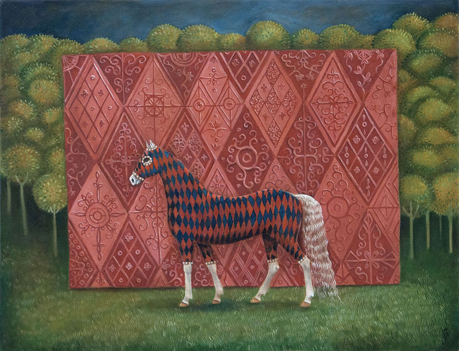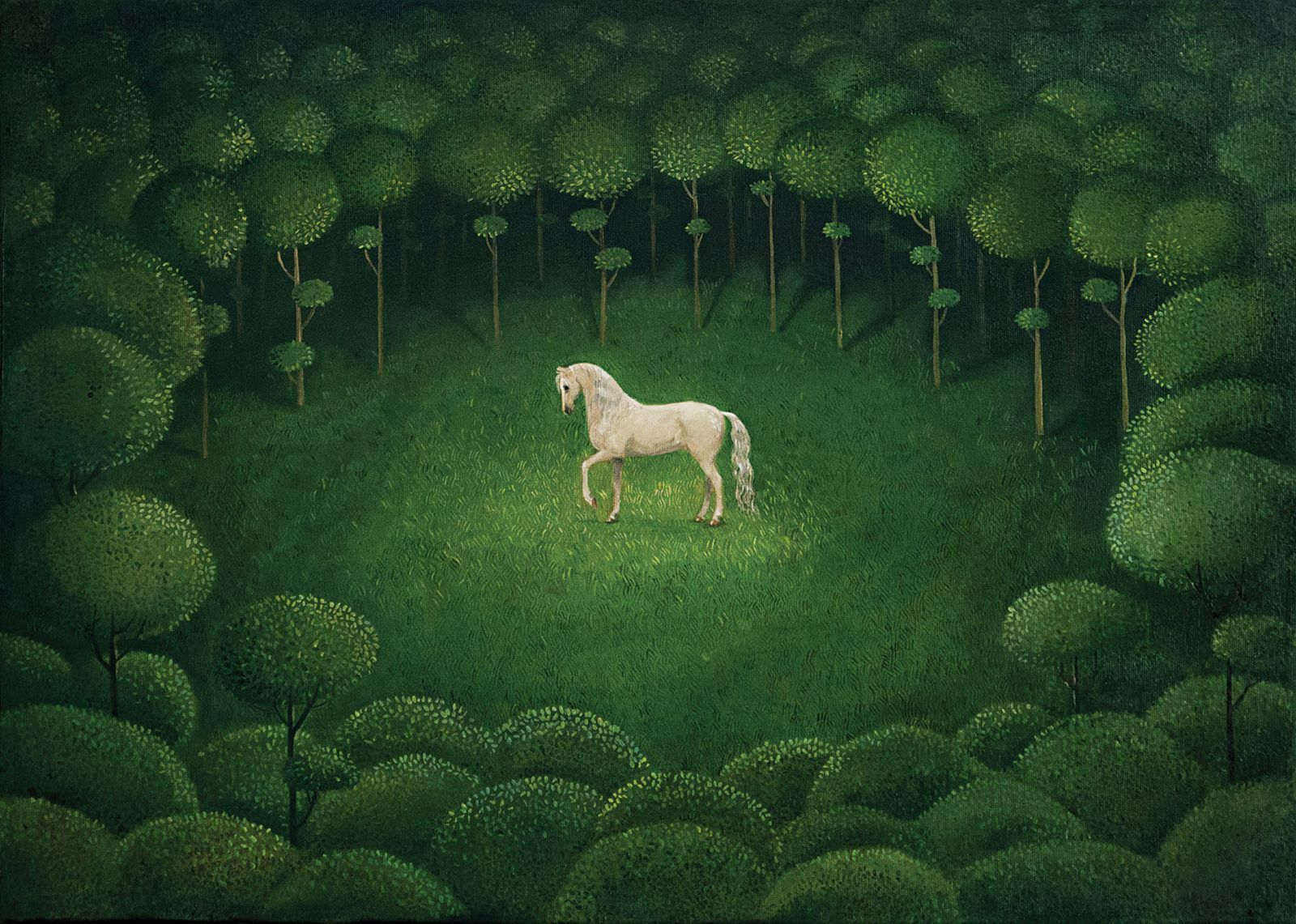 Ta bajka zawsze ze mną była, dyplom na ASP robiłam u Janusza Stannego na ilustracji. Wybrałam „Konika Garbuska”. W ogóle to uwielbiam malarstwo średniowieczne. Tam skupiano się na opowiadaniu historii, mniej na oszukiwaniu przestrzeni. I różne rzeczy się działy w tle, obok głównej opowieści. Ja też ukrywam na obrazach takie małe niespodzianki, choćby zająca na drzewie. Mam duszę ilustratora, lubię opowiadać.