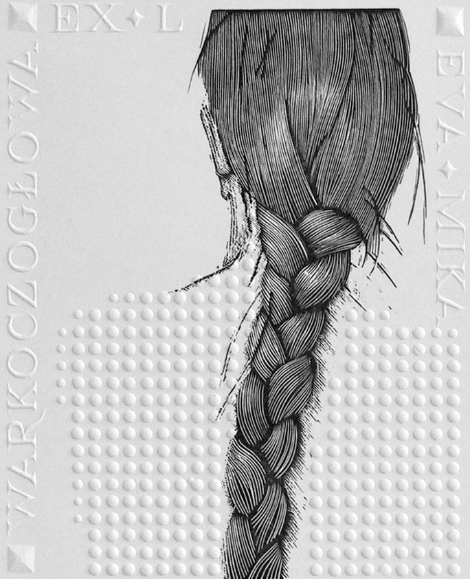 Jak patrzę na swoje starsze ekslibrisy, to myślę, że dziś miałbym kłopot z ich wycięciem (śmiech). Zrobiłem ich trochę, dla bliskich i przyjaciół. Łączę tu linoryt z drukiem ślepym, czyli odciskam wzór tłokiem, by uzyskać wypukły, reliefowy rysunek. Tłoczona płaszczyzna dobrze wygląda przy bocznym oświetleniu, bo widać ten trójwymiar i wszystko ze sobą gra. W ekslibrisie ważny jest pomysł: znajomej portrecistce zrobiłem taki z ujęciem tyłu głowy, widać tylko warkocz, a nie twarz, w której malowaniu się specjalizuje.