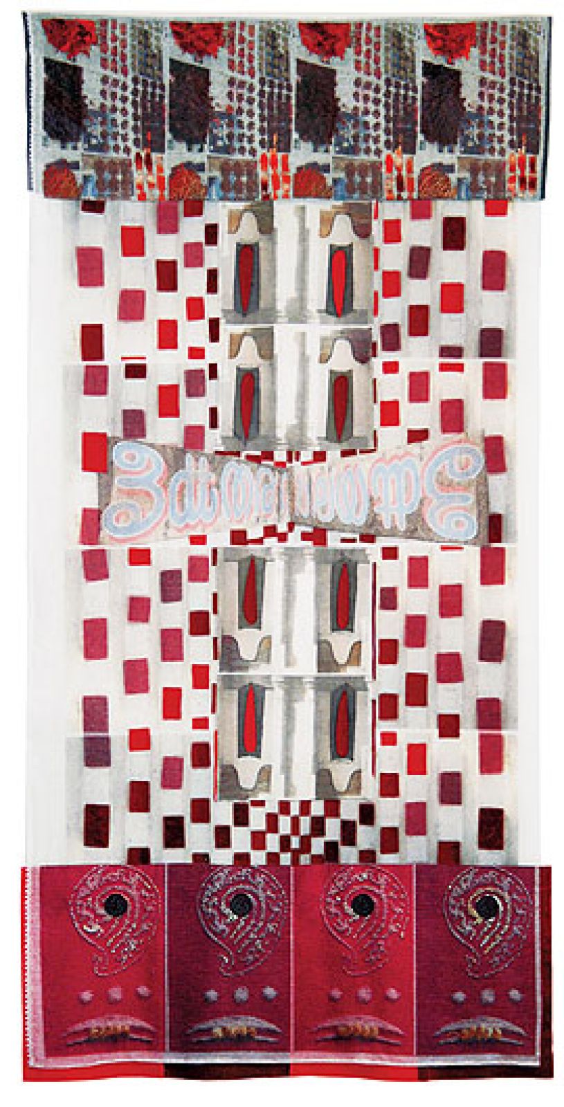 Znów pasjonuje ją tkanina, lecz traktowana nietradycyjnie. Na płachty lnu czy bawełny komputerowo przedrukowuje motywy ze zdjęć. Potem nakłada przezroczyste warstwy, doszywa elementy, nanosi wyhaftowany rysunek. Cyzeluje detale. W efekcie pierwotny obraz ledwo majaczy pod „naddatkami”. Płaskie materie „tyją”, rozrastają się do płaskorzeźbowej grubości. W finale tkaniny Bogny przypominają abstrakcyjne witraże. Albo szale. Albo ornaty.
