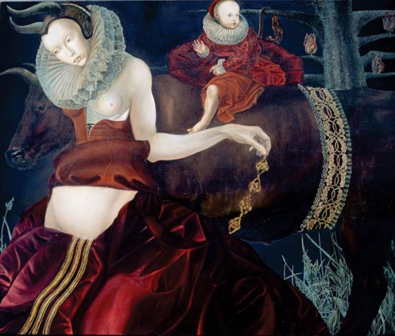 Na jej obrazach rozgrywają się sceny z mitów i opowieści biblijnych, a czasem historie zupełnie zmyślone. Pełno tu półnagich piękności, jednorożców, egzotycznych ptaków i ryb, kuszących owoców granatu i rajskich jabłek. Wszystko przypomina groźną bajkę, bo piękno i brzydota mieszają się ze sobą w niepokojący sposób.