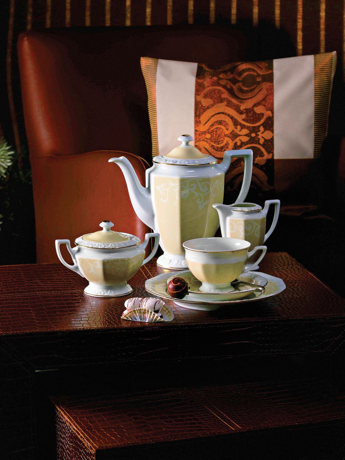 Historia zaczęła się podczas podróży do Anglii, gdzie fabrykant kupił stuletni srebrny garnitur do herbaty, który zainspirował go do zaprojektowania serwisu. Całego w bieli, w ciekawym ośmiokątnym kształcie. Natomiast krawędzie dzbanków, czajniczków, talerzy czy pater ozdobił bordiurą z kwiatów granatu, które symbolizują płodność i miłość.