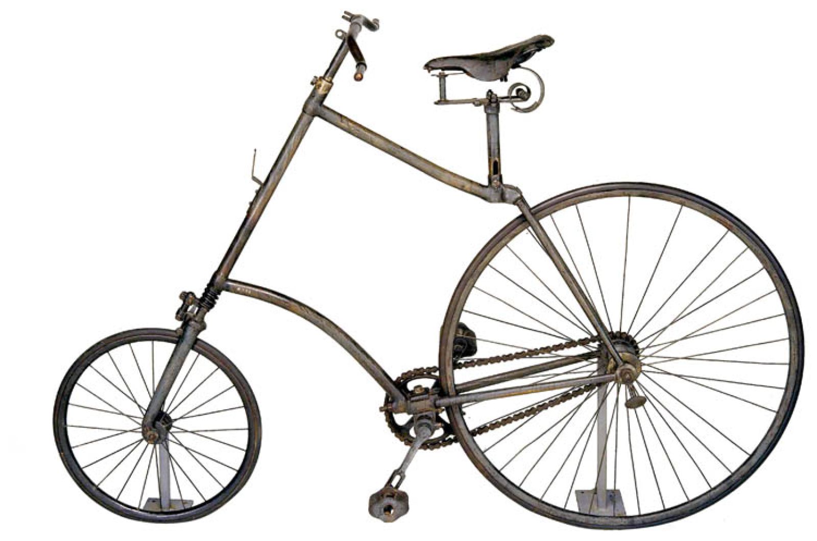 Do tego stopnia, że pojazd stał się wywrotny. I wtedy w 1868 roku Guilmet i Meyer opatentowali łańcuch, a pedały przenieśli na środek welocypedu. Kariera roweru nabrała rozpędu. Wkrótce Anglik Harry J. Lawson przerzucił napęd na tylne koło (1879 rok), a John K. Starley wprowadził ramę z rur oraz koła o równej średnicy (1885 rok). Ten ostatni wyprodukował Rover (co znaczy wędrowiec, włóczęga) i nazwa się przyjęła. W końcu w II poł. XIX wieku bracia André i Edouard Michelin wynaleźli gumowe opony. Trzęsikości stały się lekkie i poręczne.