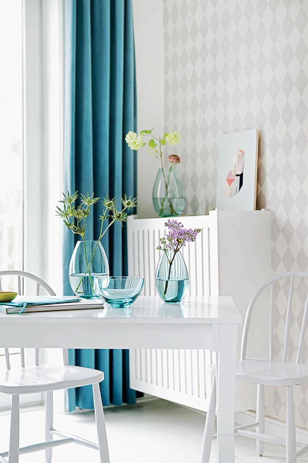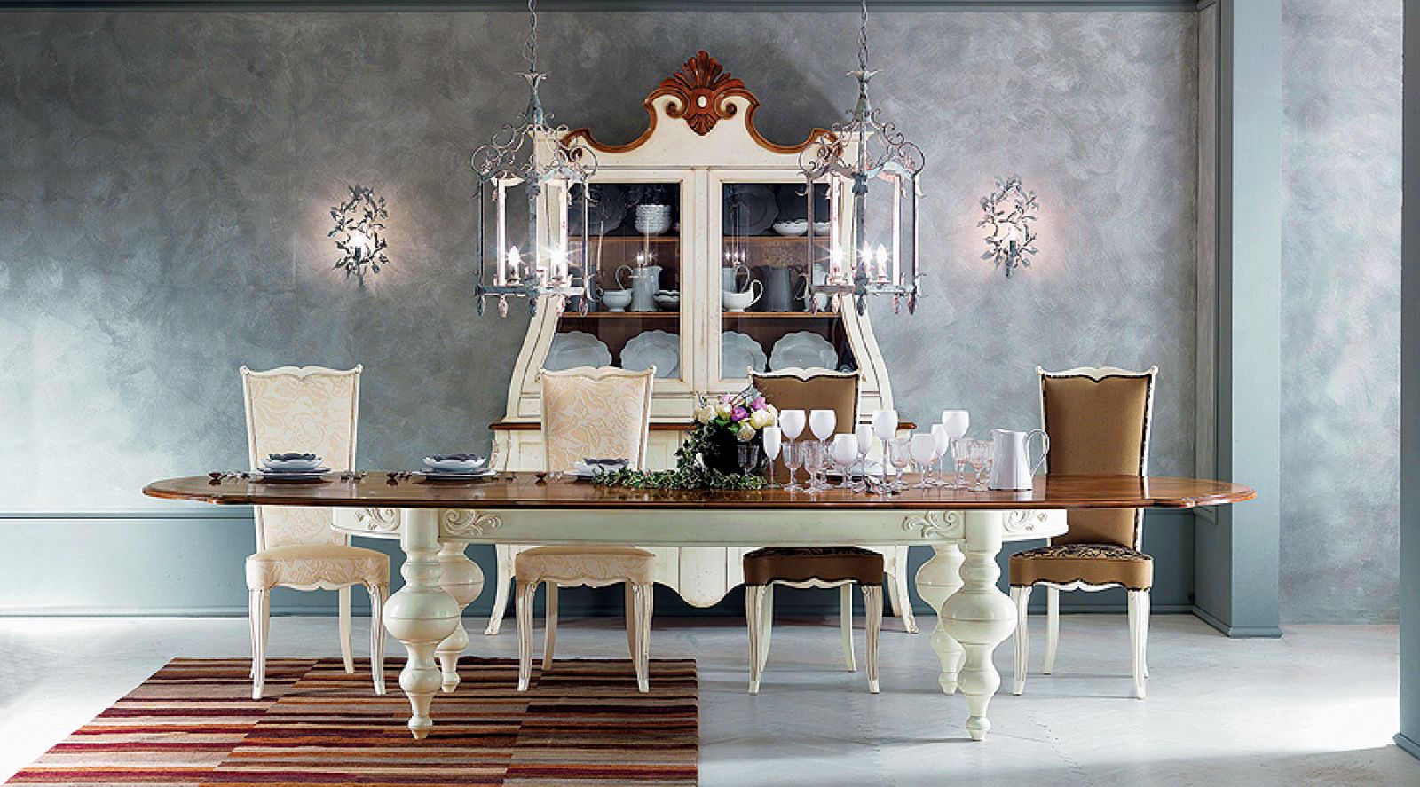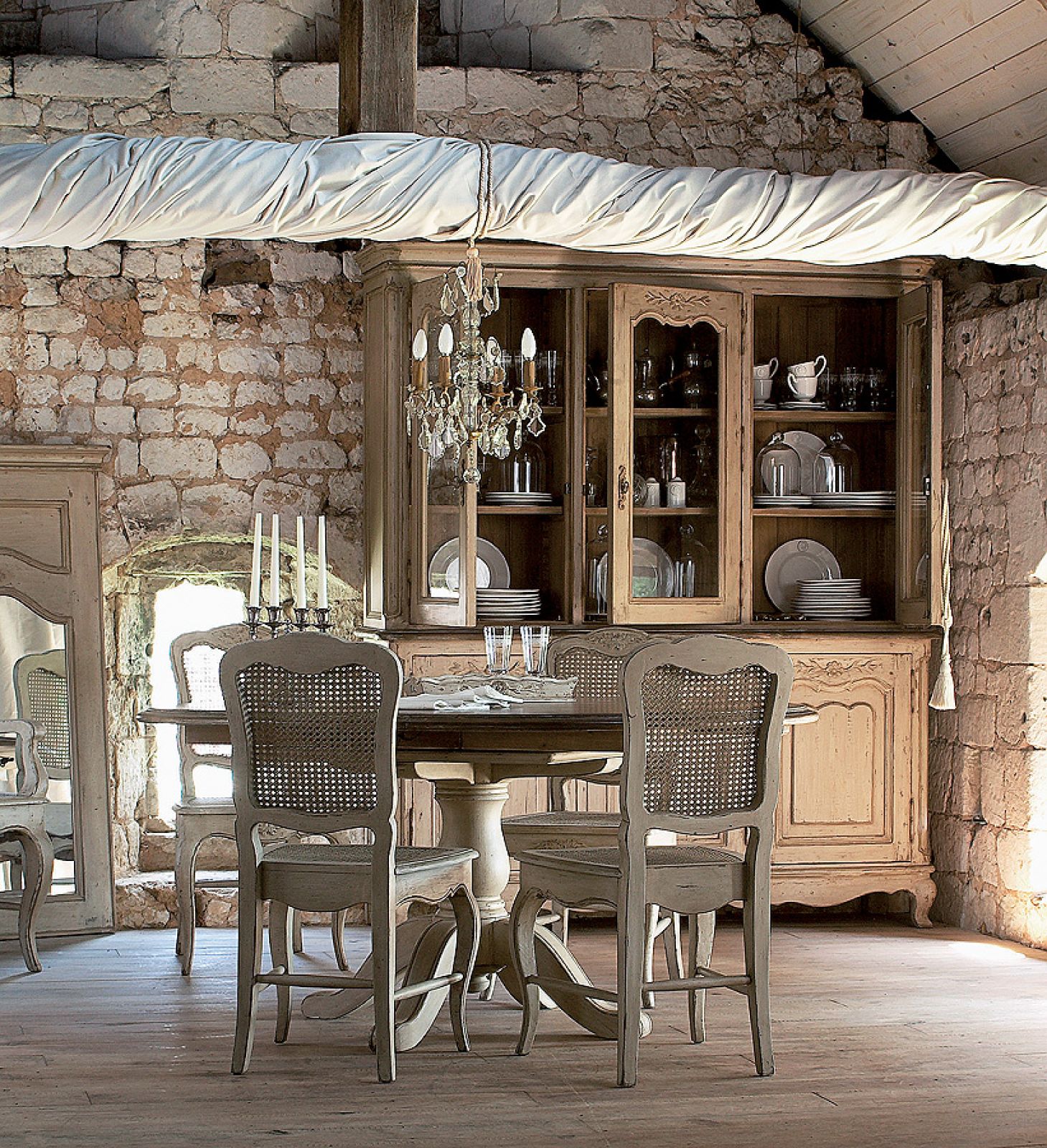 Albo „Pod słońcem Toskanii”, scena, gdy Frances Mayes podaje robotnikom włoskie przysmaki. Jadalnia – w amfiladzie z kuchnią. Prostokątny stół z grubym blatem stoi pod ścianą ze starymi freskami. Kolory: kremy, zielenie, palona sjena. Słowem: country chic.