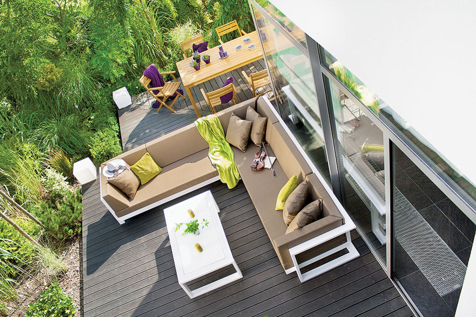 Urządzenie salonów pod chmurką zależy od tego, co właściciele chcą robić. Czy tylko od czasu do czasu oglądają swoje włości, czy już po pracy wypijają kawę pod pergolą, w weekend zjadają śniadanie przy stoliku na tarasie koło kuchni i tutaj też podają obiad. Jeśli często podejmują znajomych, wówczas potrzebny będzie większy stół. A może lubią wieczorami organizować grillowanie i przyjęcia przy basenie?