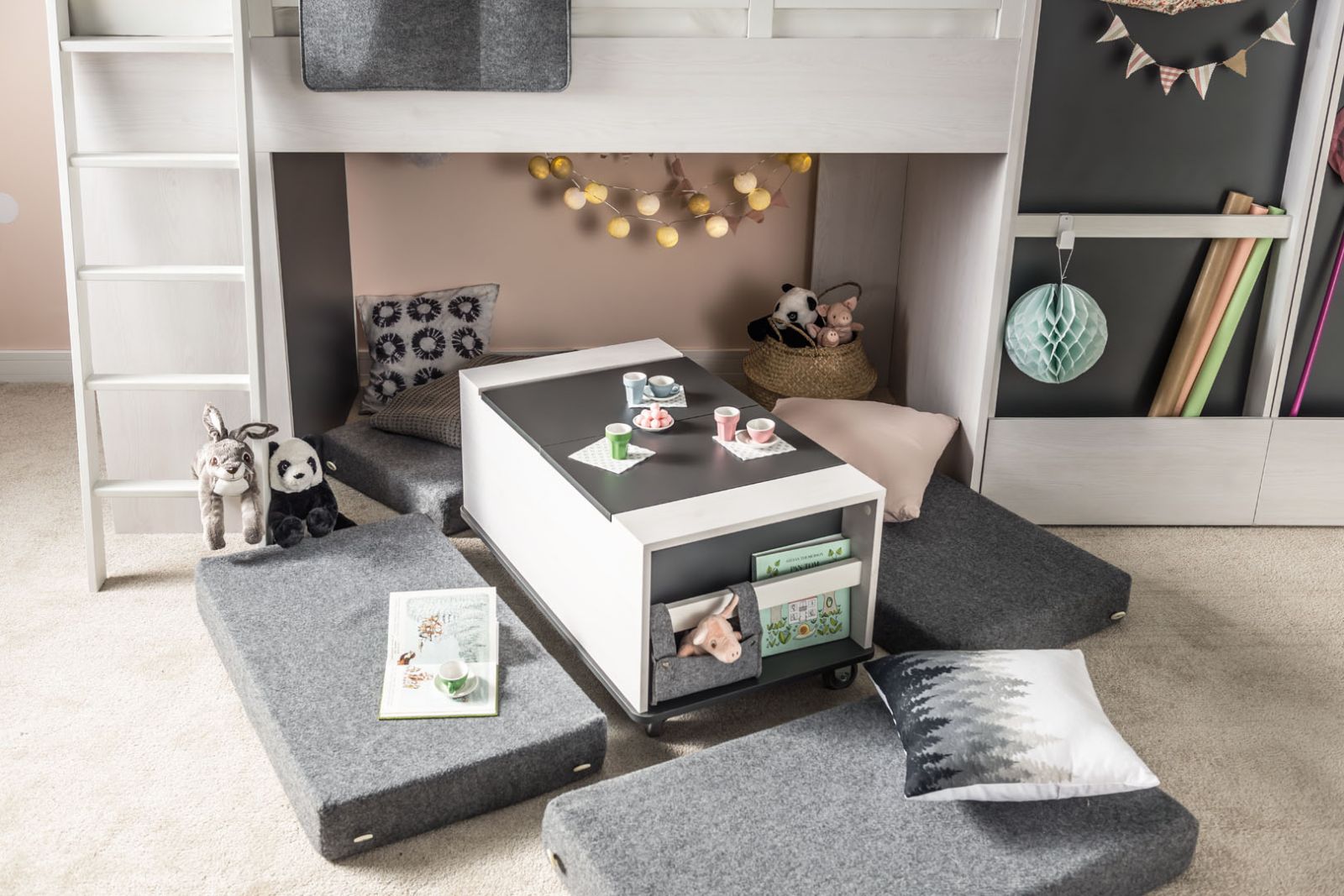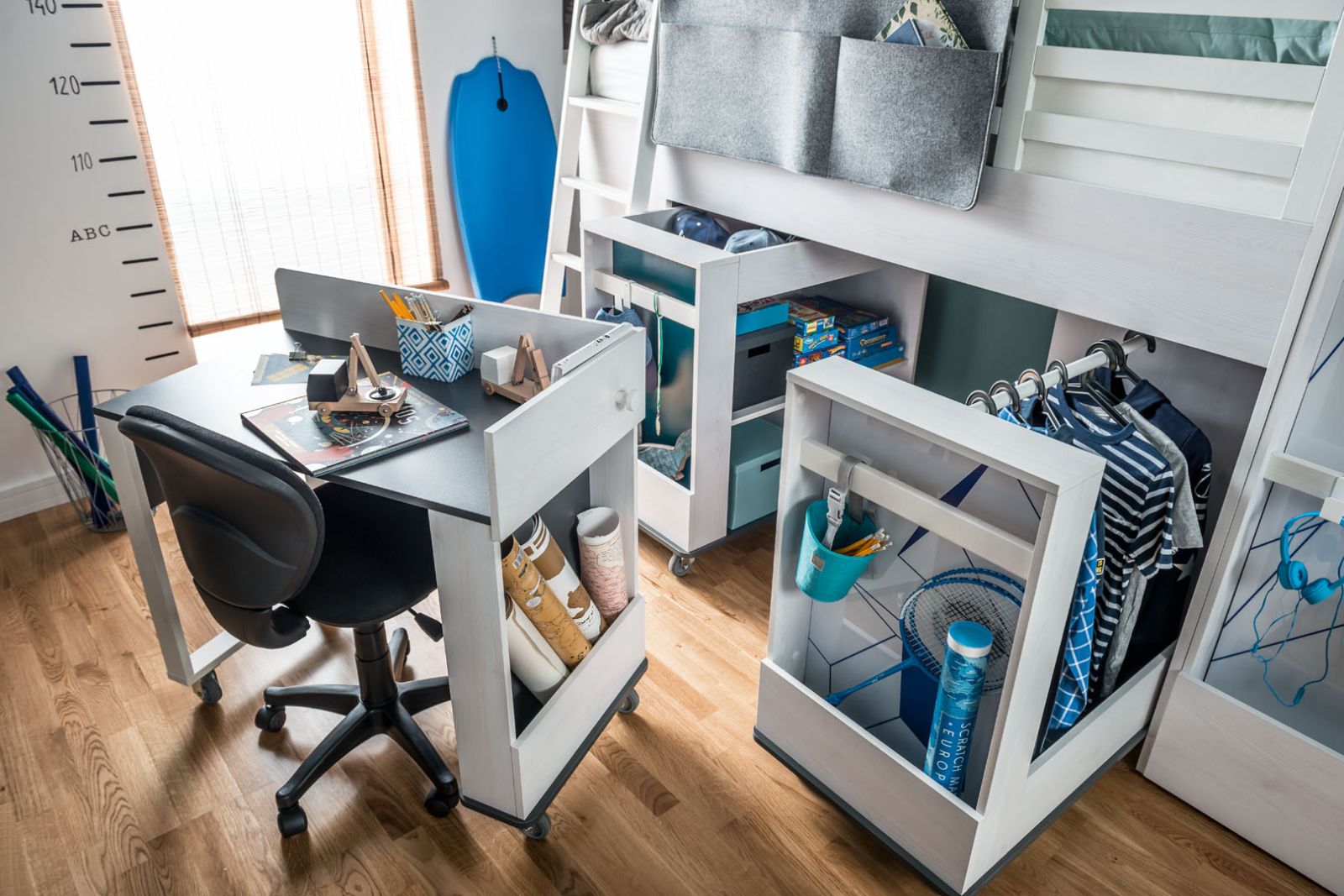 W kolekcji znalazły się też pozostałe meble niezbędne w pokoju dziecięcym: biurko, regał na książki, szafa na ubrania wiszące, pojemniki na zabawki oraz materac do zabaw. A wszystko w ramach jednego łóżka, które można rozbudowywać i nadawać mu kolejne funkcje. Kontenerki, gdy tylko nie są używane, z łatwością schować można pod łóżkiem, tak aby nie zabierały miejsca w pokoju.