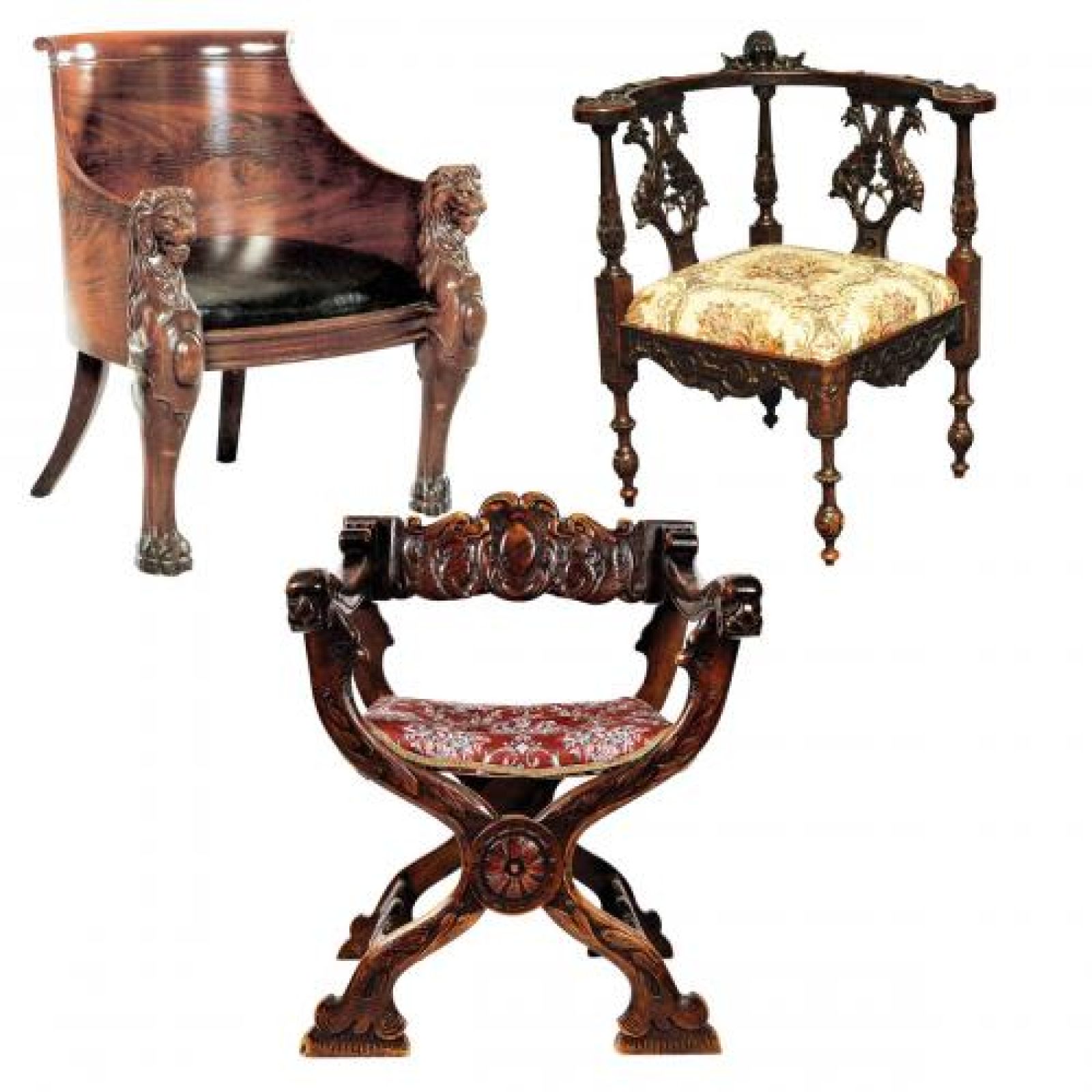 Pojawiły się leżanki i sofy w kształcie egzotycznych łodzi o smukłym dziobie i zaokrąglonej rufie. Na meblach rzeźbiono sfinksy, delfiny i krokodyle. Nie brakowało motywów roślinnych – wyjątkowo podobały się wiciokrzew i antemion, czyli ornament ze stylizowanych liści (najczęściej palmy) i kwiatów. Jednym z głównych wynalazków tej epoki jest méridienne, typ szezlonga o obu krótszych bokach. Jeden z nich można było rozłożyć i zyskać więcej miejsca.