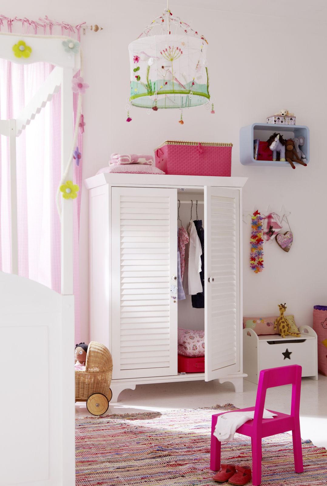 W pokoju dziecka powinna dominować przede wszystkim jasność. Stawiamy więc na białe ściany, które będą tłem dla mebli (w kolorze drewna, pasteli, ale także białych) oraz kolorowych dodatków (rolet, półek, zabawek, pojemników na zabawki).