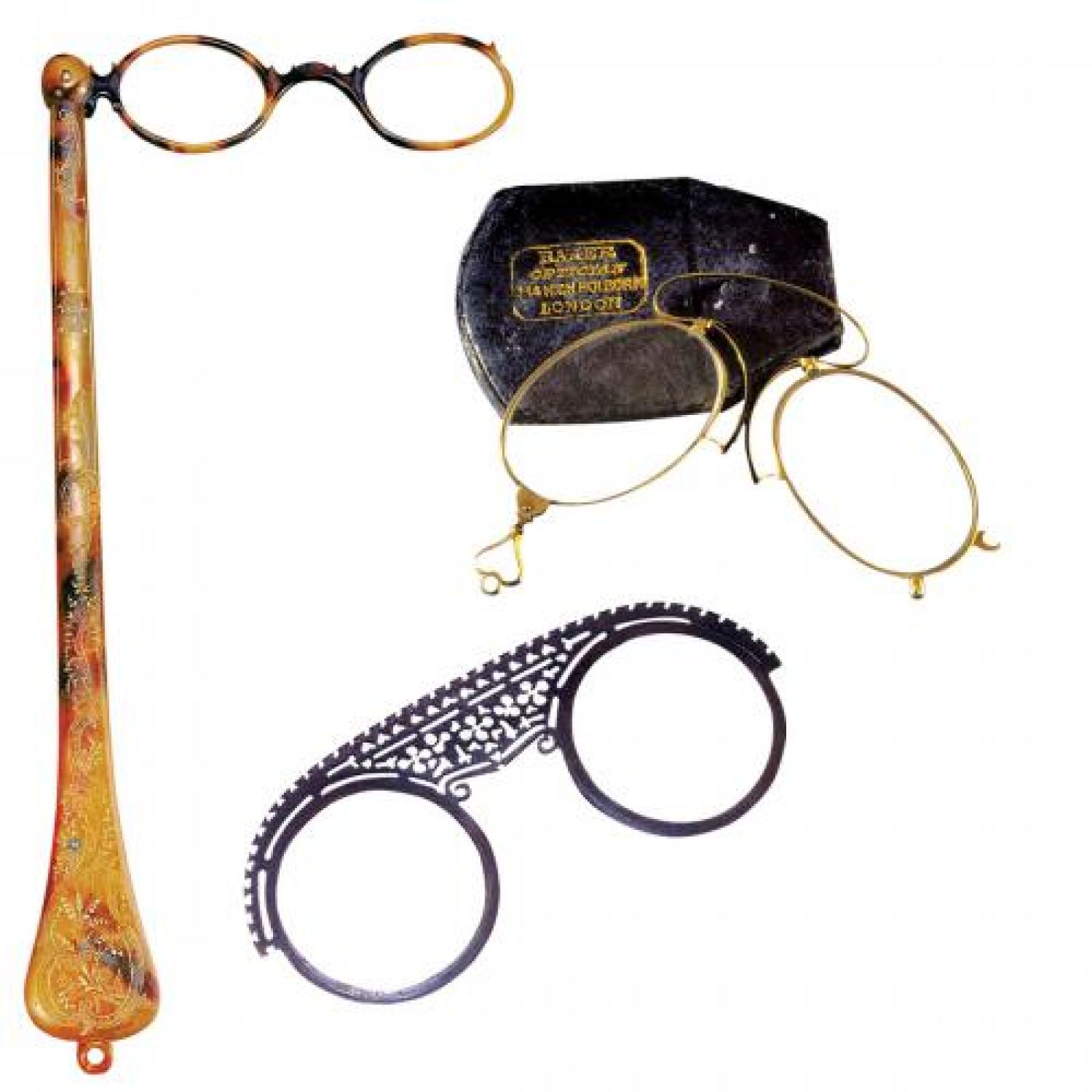 Pod wpływem mody, ale i unowocześniania wynalazku, zmieniał się kształt okularów. Początkowo soczewki były okrągłe, zamontowane w prostej oprawie, zakładanej na nos. Takie okulary trzeba było przytrzymywać ręką. Popularne i tanie były oprawki skórzane, drewniane i kościane, droższe modele robiono ze złota i srebra. Później kształt soczewek zmienił się na owalny, a wreszcie, w połowie XIX wieku, zaczęto nosić prostokątne. Pojawiło się także więcej materiałów, z których można było robić oprawy. Szkła montowano w brązie, fiszbinach wieloryba, stali, kości słoniowej oraz szylkrecie.