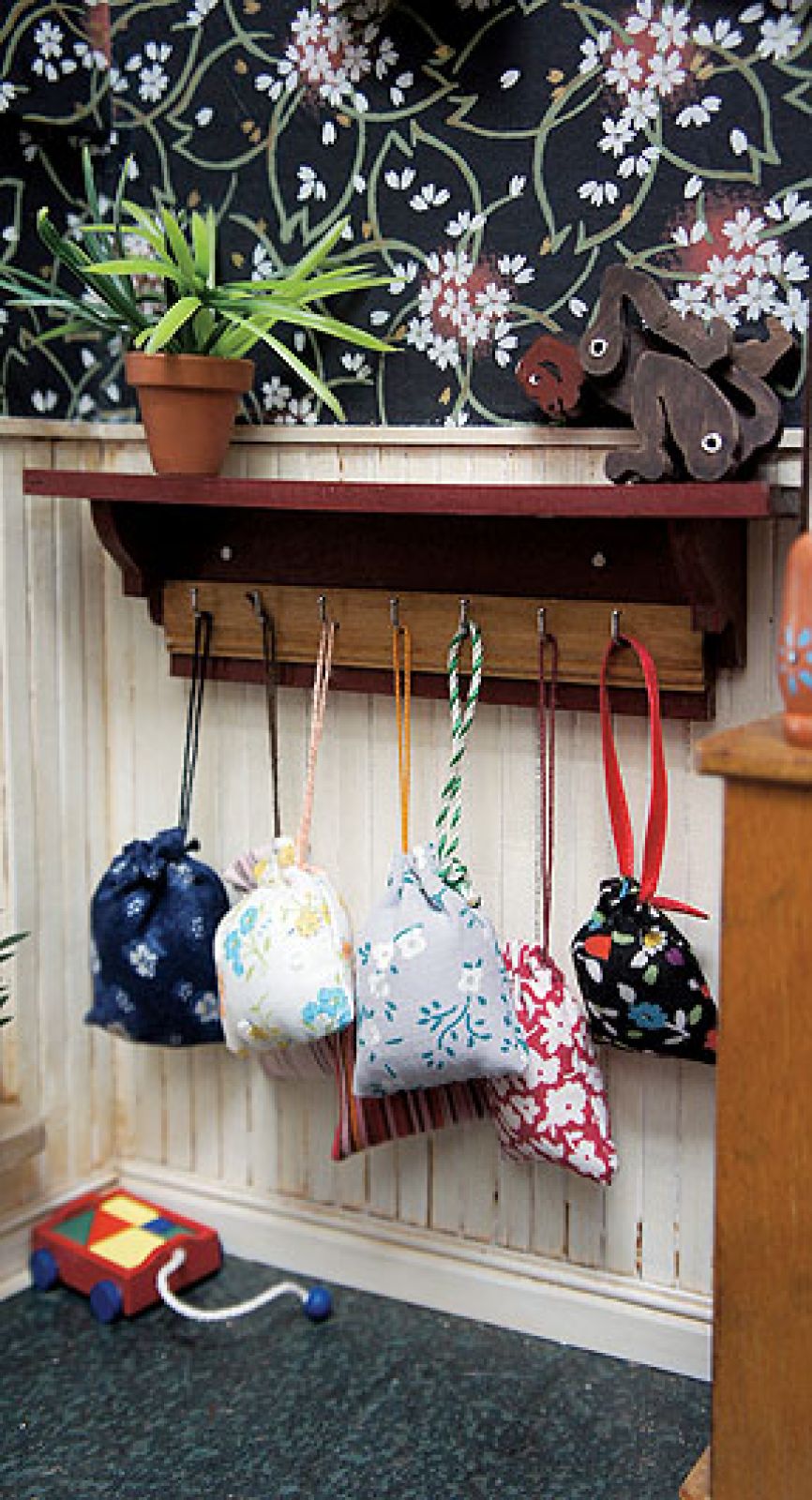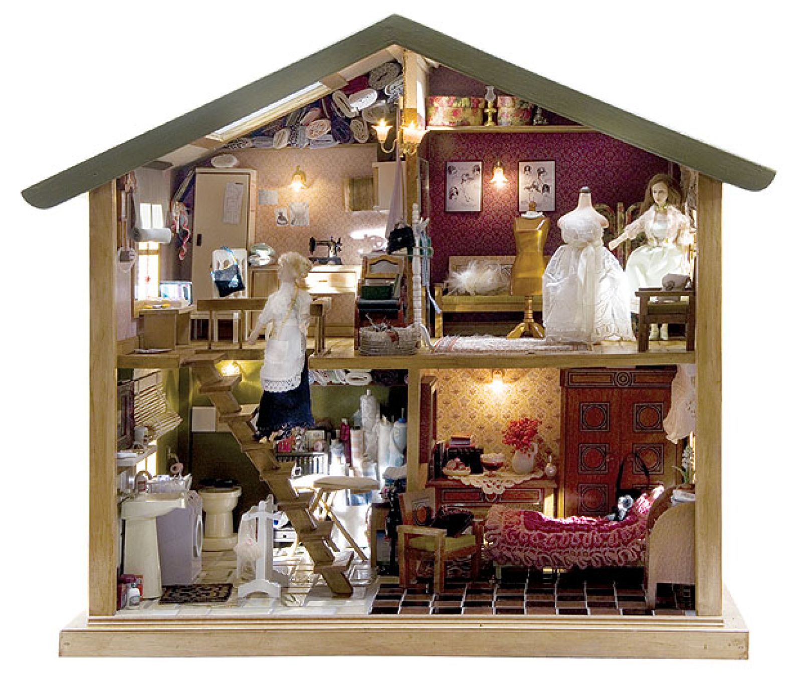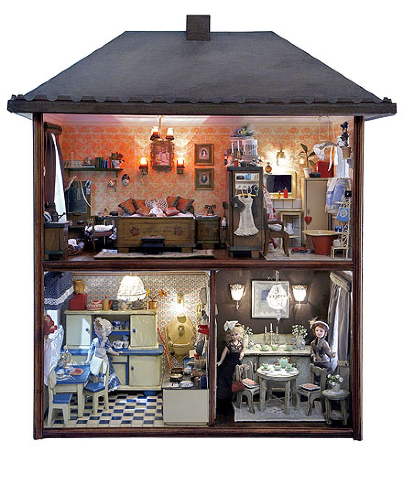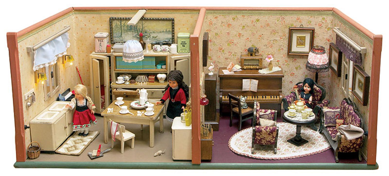 Eleganckie domki zamożni ustawiali w salonie. W ten sposób chwalili się przed gośćmi bogactwem i pokazywali pokoje dostępne tylko dla rodziny. Bywało, że w miejskiej rezydencji stawała replika wiejskiej i na odwrót – były niczym album ze zdjęciami. Nieraz miniaturowe pokoje urządzano w specjalnie do tego zrobionych kredensach: jedna półka – jeden pokój. Mieszkały w nich wytworne lalki z woskowymi rękami, porcelanowymi buziami, ubrane w jedwabne suknie, pod którymi kryły się koronkowe pantalony. Dziewczynki z podmiejskich domów bawiły się inaczej. Ich lalki były szmaciane z patyczkami zamiast rąk i nóg. Żyły w podmiejskich ubogich domkach w pokoiku z kuchnią. Wytworne zabawki robili najczęściej rzemieślnicy od normalnych sprzętów: stolarze rzeźbili meble, garncarze lepili ceramikę, ludwisarze odlewali komplety malutkich cynowych naczyń.