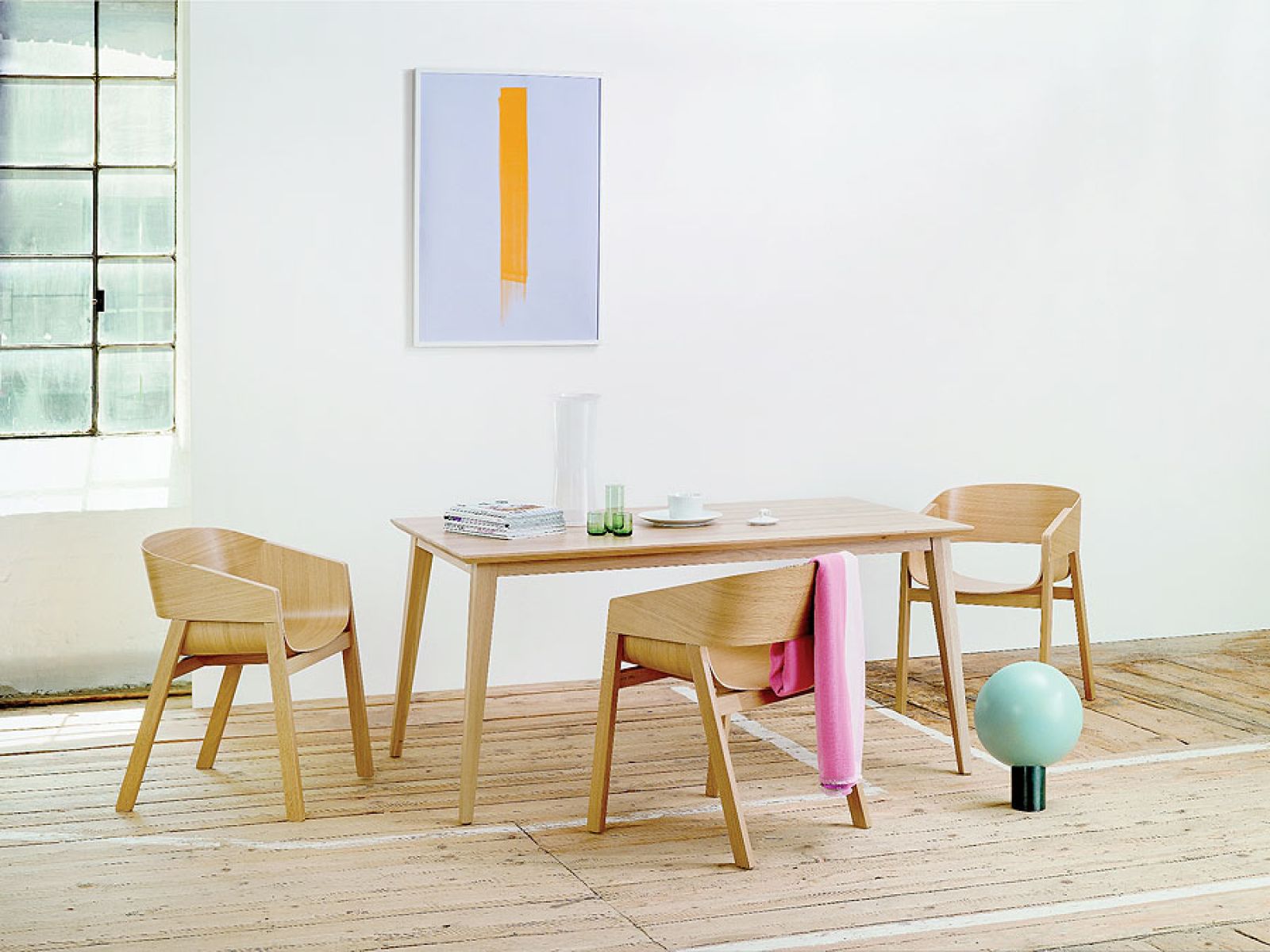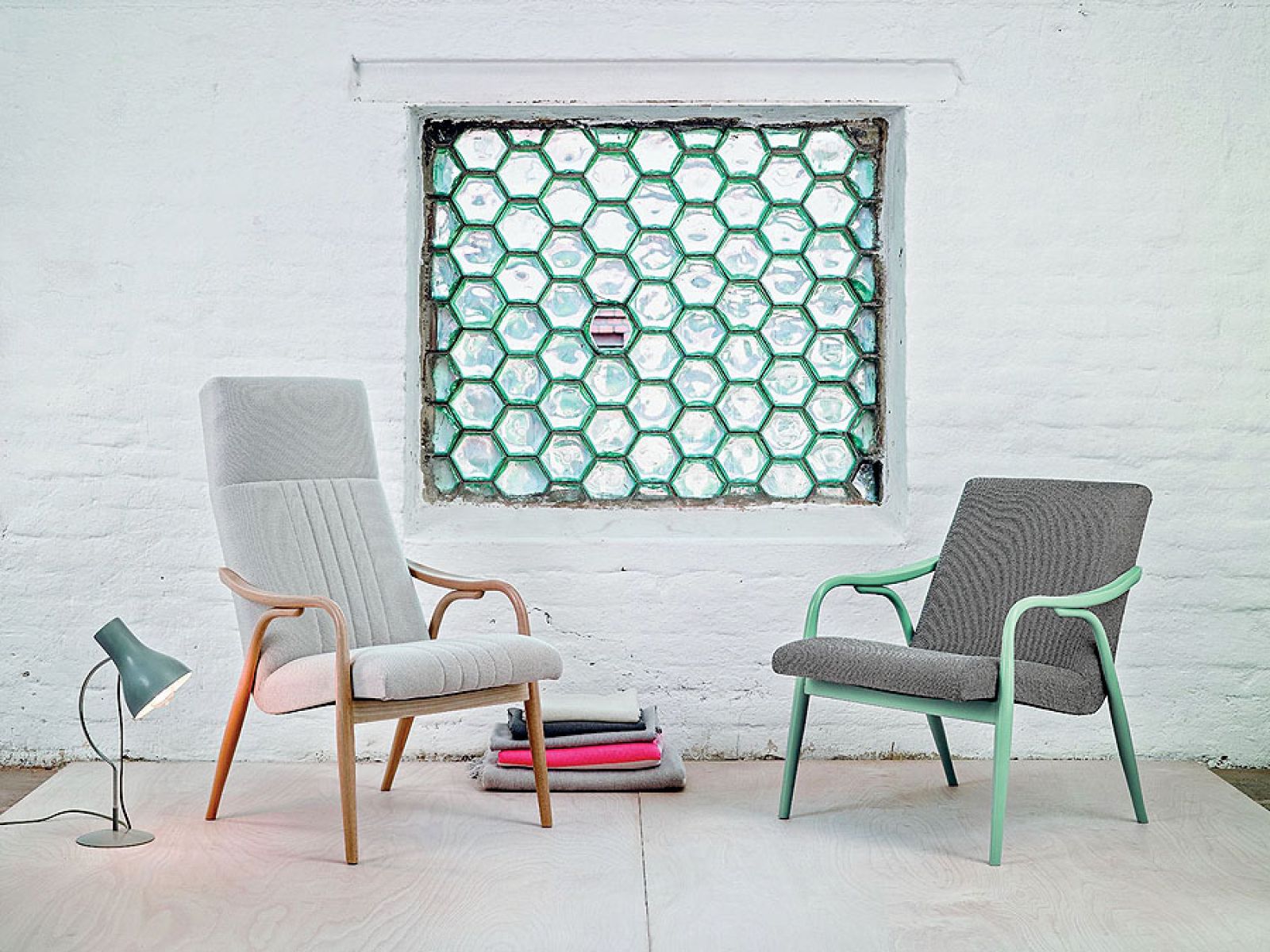 Klasyki maluje na bajkowe kolory, wymyśla też nowe modele, oczywiście gięte – najczęściej z bukowego drewna, ale także ze sklejki. Nowoczesne, minimalistyczne, jak fotele Merano czy Mojo, złożony z zielonych poduch Dowel albo tylko z trzech elementów – 02.