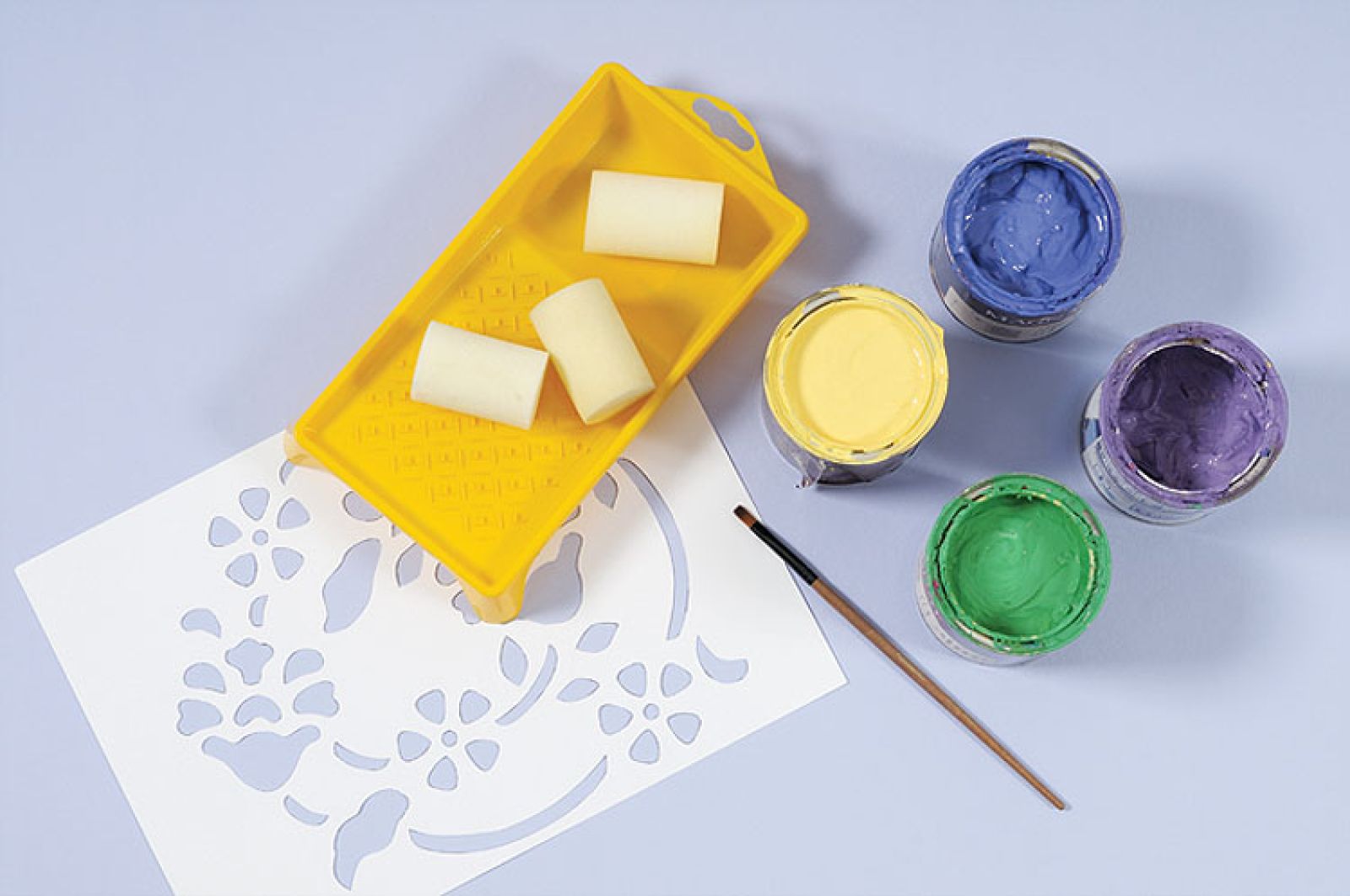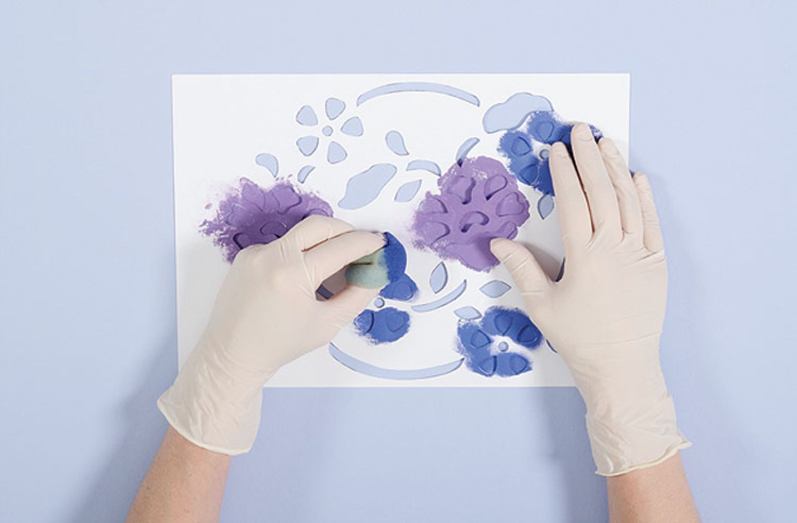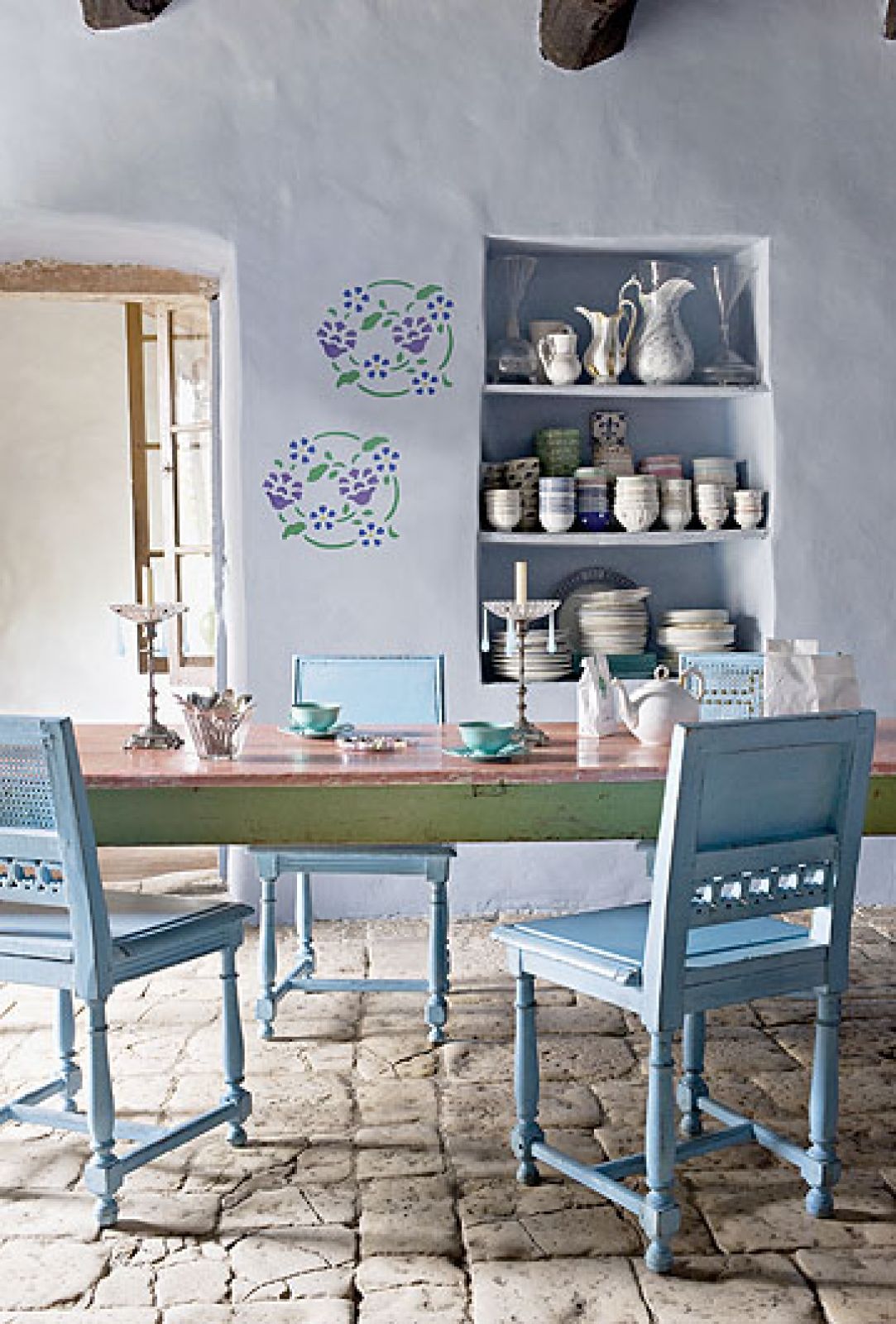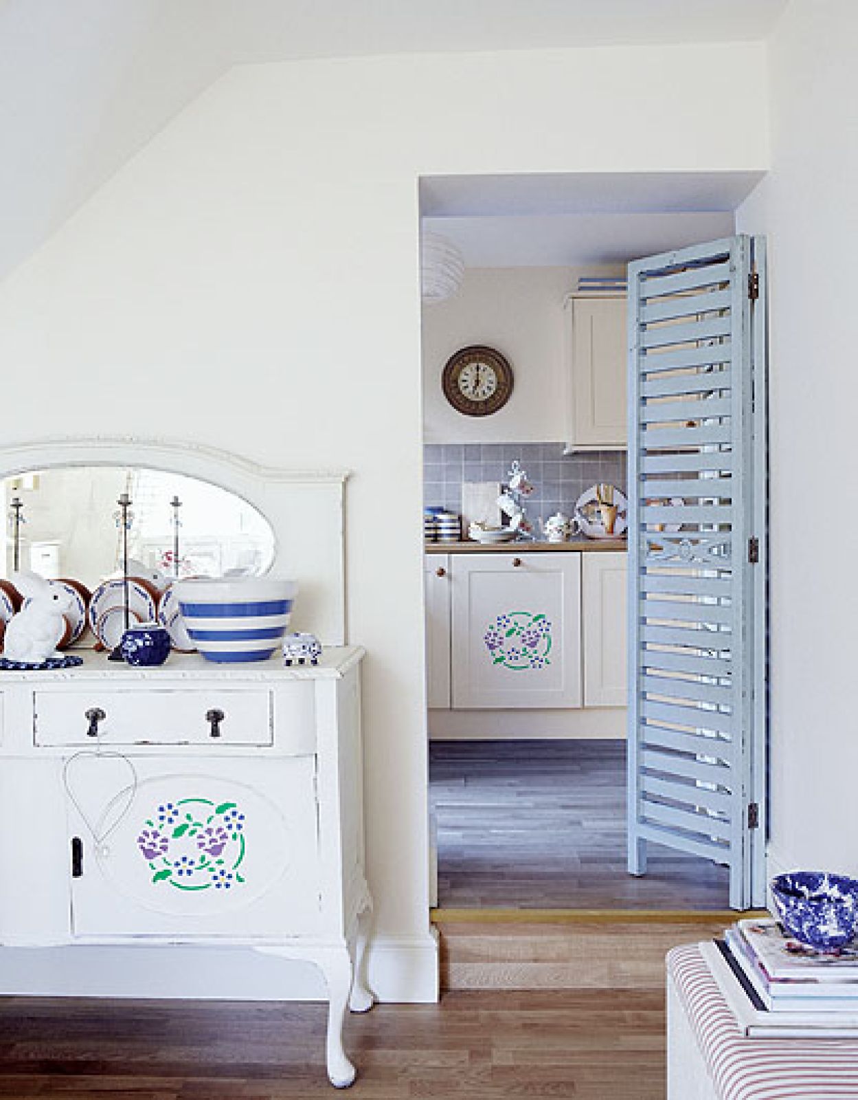 Tym razem nietypowo – zamiast tradycyjnego szlaczka pod sufitem proponujemy fresk w owalu. Wzór namalujemy na skrzydle drzwi albo pustej ścianie. Stylizowane powoje i chabry koleżanka podpatrzyła na francuskiej tkaninie kupionej na Les Puces. To najsłynniejszy paryski targ staroci. Kwiatowy motyw był duży i powielony na materiale tylko kilka razy – tak jest dekoracyjny. Kolory możemy zmienić, my wybraliśmy takie, które kojarzą się z prowansalską lawendą i błękitem śródziemnomorskiego nieba.