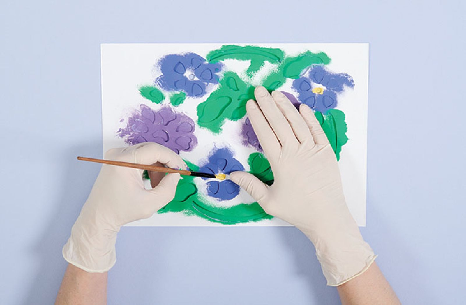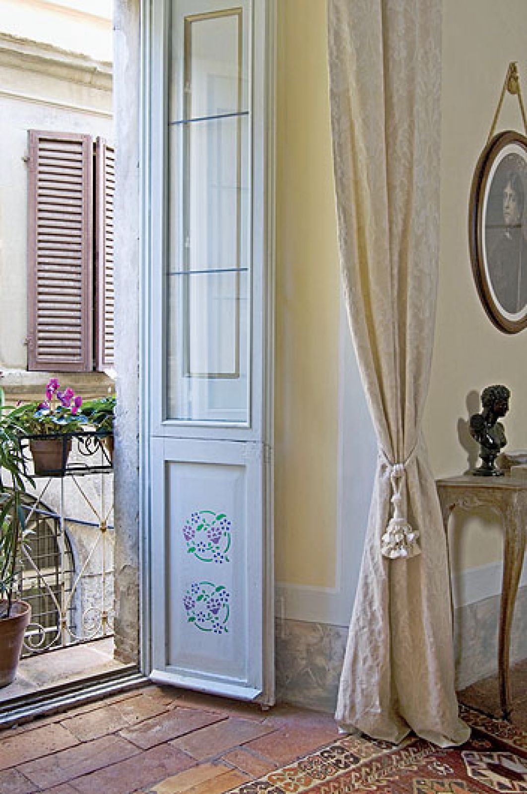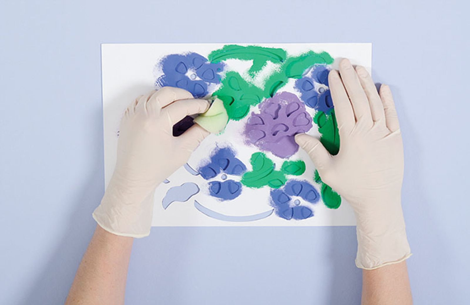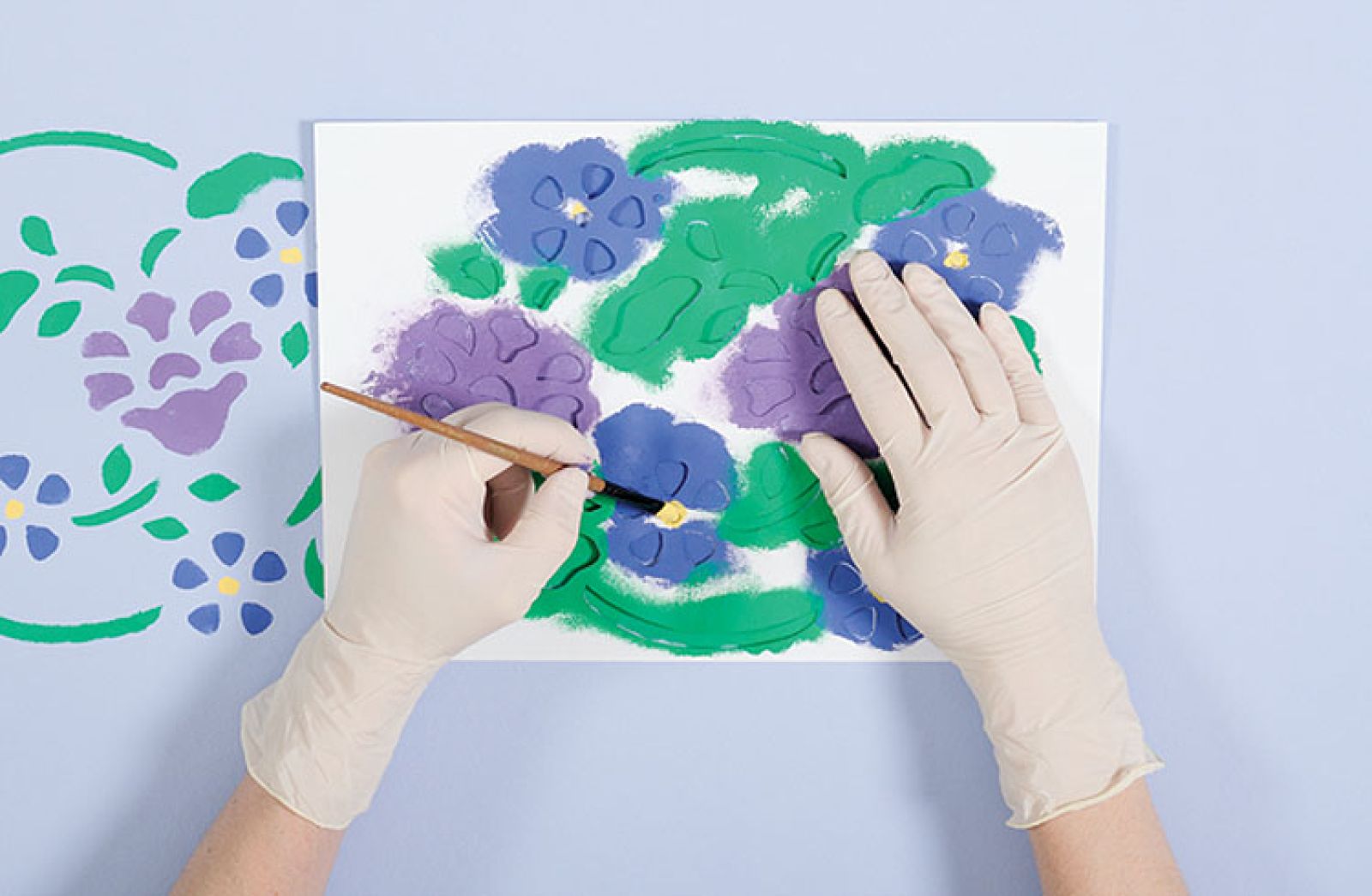 Tym razem nietypowo – zamiast tradycyjnego szlaczka pod sufitem proponujemy fresk w owalu. Wzór namalujemy na skrzydle drzwi albo pustej ścianie. Stylizowane powoje i chabry koleżanka podpatrzyła na francuskiej tkaninie kupionej na Les Puces. To najsłynniejszy paryski targ staroci. Kwiatowy motyw był duży i powielony na materiale tylko kilka razy – tak jest dekoracyjny. Kolory możemy zmienić, my wybraliśmy takie, które kojarzą się z prowansalską lawendą i błękitem śródziemnomorskiego nieba.