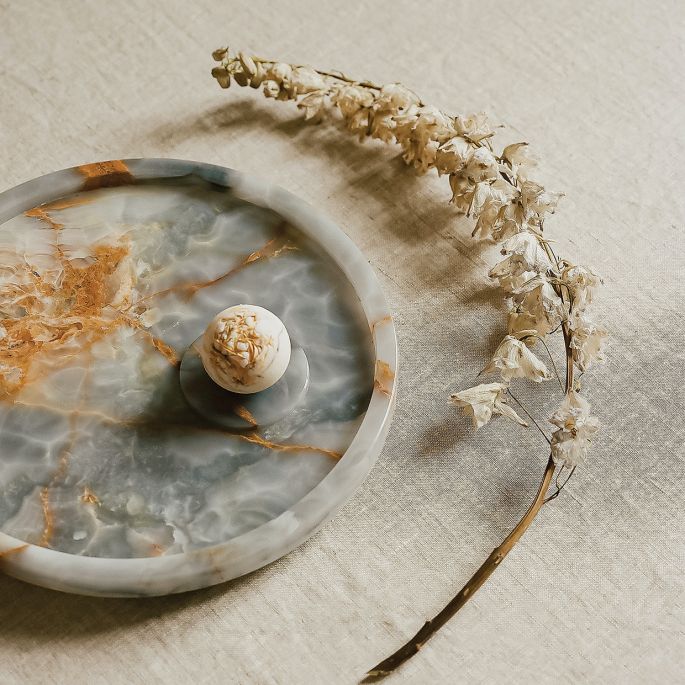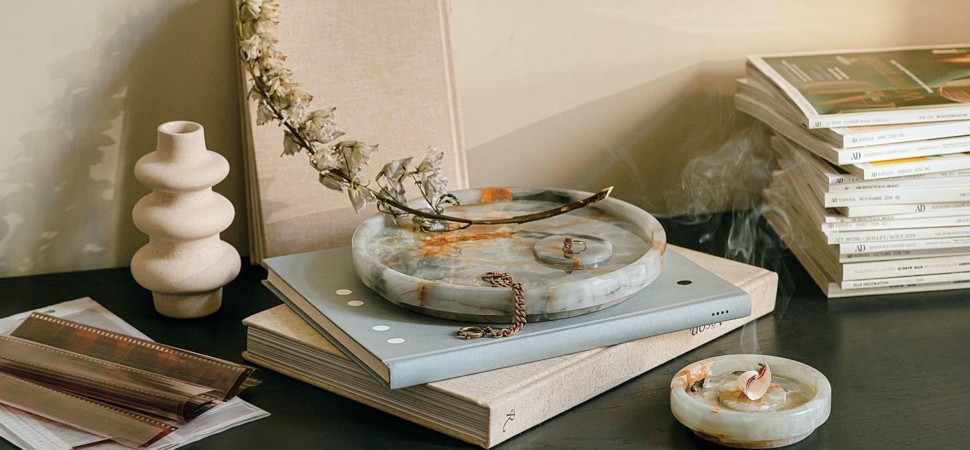 ProjektanciTace, świeczniki i mydelniczki mają proste kształty, które podkreślają naturalne piękno kamienia: niezwykłe, cieniowane kolory, żyłki, przejrzystość. Oto oryginalne dodatki do wnętrz z onyksu od Yox Concept.