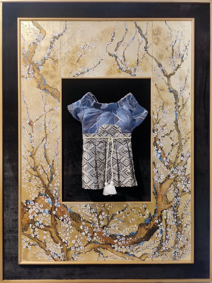Mały cavalier spaniel odbył długą podróż ze swoimi opiekunami do Japonii, bo dopiero tam znalazł się chirurg weterynarz. Przygotowałam duży, ręcznie malowany panel eksponujący kimono. Przekazanie dzieła było bardzo wzruszające, a Gucio z ogromnym zainteresowaniem oglądał swój podróżny strój w zdobnej ramie.