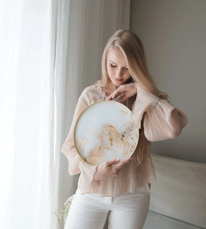 …dlatego sposoby artystycznego wykorzystania tego materiału, bardzo popularnego w USA i Australii, które znalazłam na Instagramie, niezbyt mi się podobały. Były zbyt ozdobne – jakieś fale, zatopione kształty. Postanowiłam na żywicy malować autorską techniką z wykorzystaniem płatków złota i barwników, które sama tworzę – zielonych, niebieskich. Moje prace były proste i przypominały marmur z naturalnym, delikatnym rysunkiem. A przy tworzeniu okrągłego obrazu, wpadłam na pomysł, aby robić także tace.