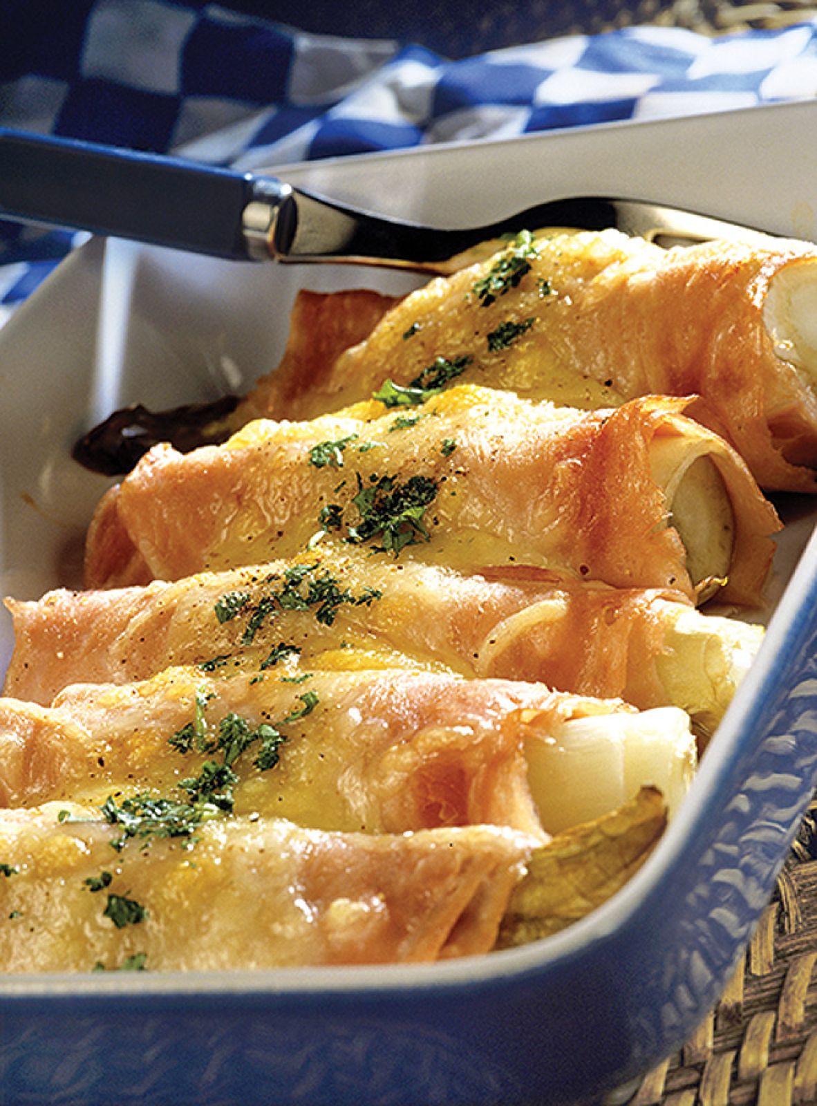 Weź: •8 cykorii •łyżkę masła •łyżkę mąki •szklankę mleka •pół szklanki startego emmentalera •dużą szczyptę świeżo startej gałki muszkatołowej •8 plastrów gotowanej szynki •3 gałązki natki pietruszki •sól i pieprz do smaku