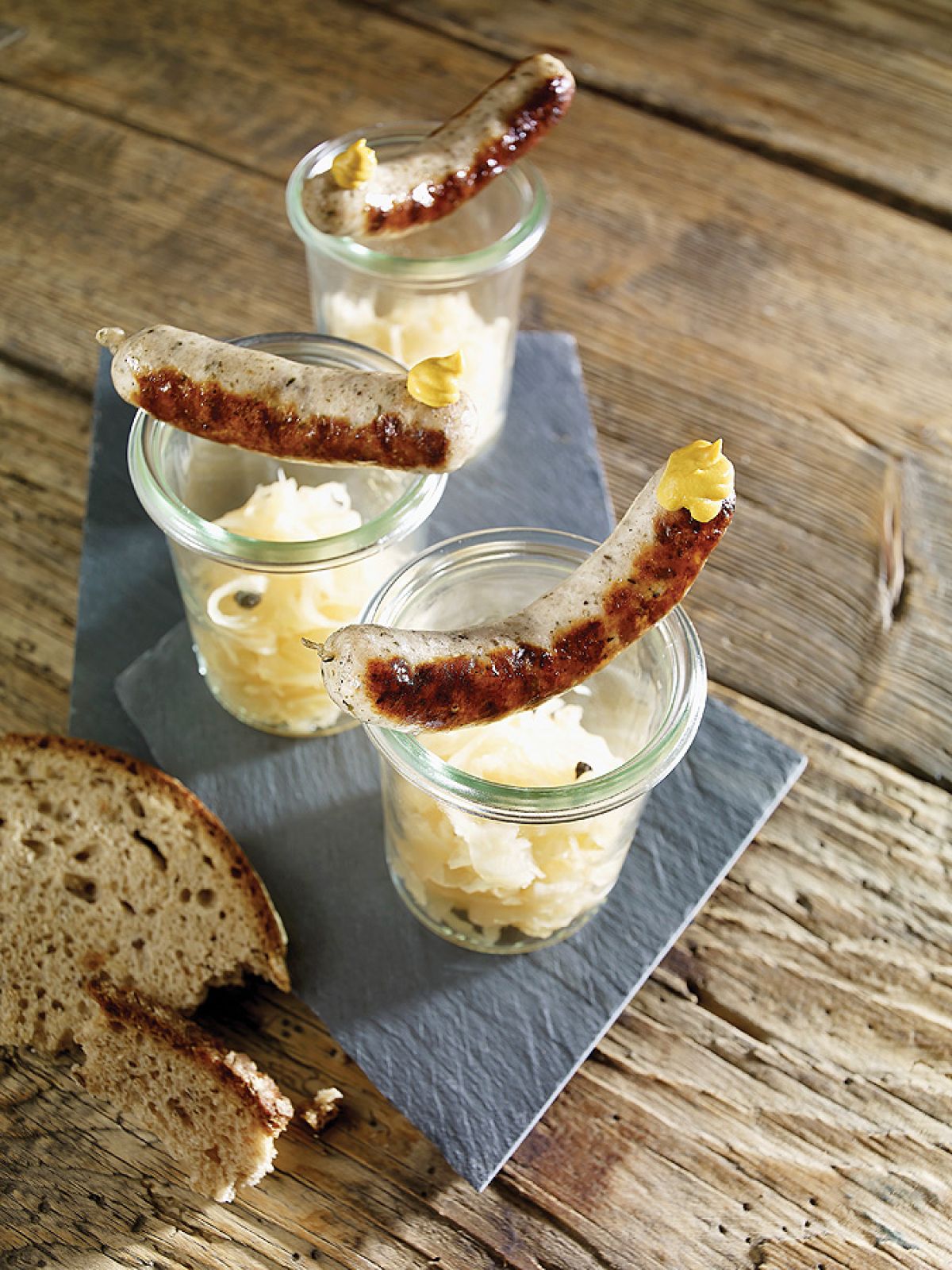 Zagrzej olej w garnku, dorzuć kapustę i chwilę mieszaj. Zalej kapustę połową szklanki wody, dodaj przyprawy i duś na małym ogniu kwadrans. Kiełbaski zgrilluj albo przesmaż na rumiano. Do słoiczków lub miseczek nałóż po łyżce kapusty, na wierzch połóż kiełbaskę. Podawaj z bawarską słodką musztardą.