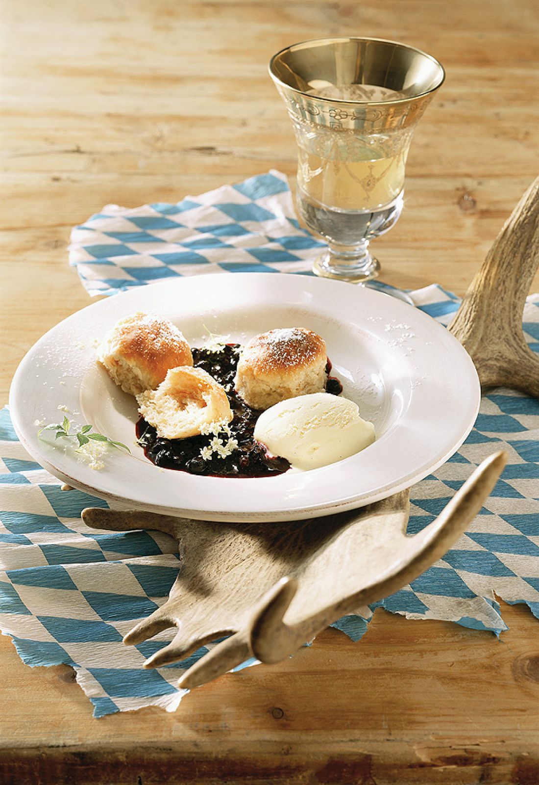 Zrób sos – jagody bzu wrzuć do rondla, dodaj cukier, sok z cytryny, cynamon i przekrojoną wzdłuż laskę wanilii. Gotuj kilka minut, wyłów wanilię, wyskrob nożem nasionka i wrzuć z powrotem do rondla. Zdejmij z ognia, wsyp mąkę ziemniaczaną, zamieszaj i znów zagotuj. Bułeczki podawaj z sosem i lodami waniliowymi.