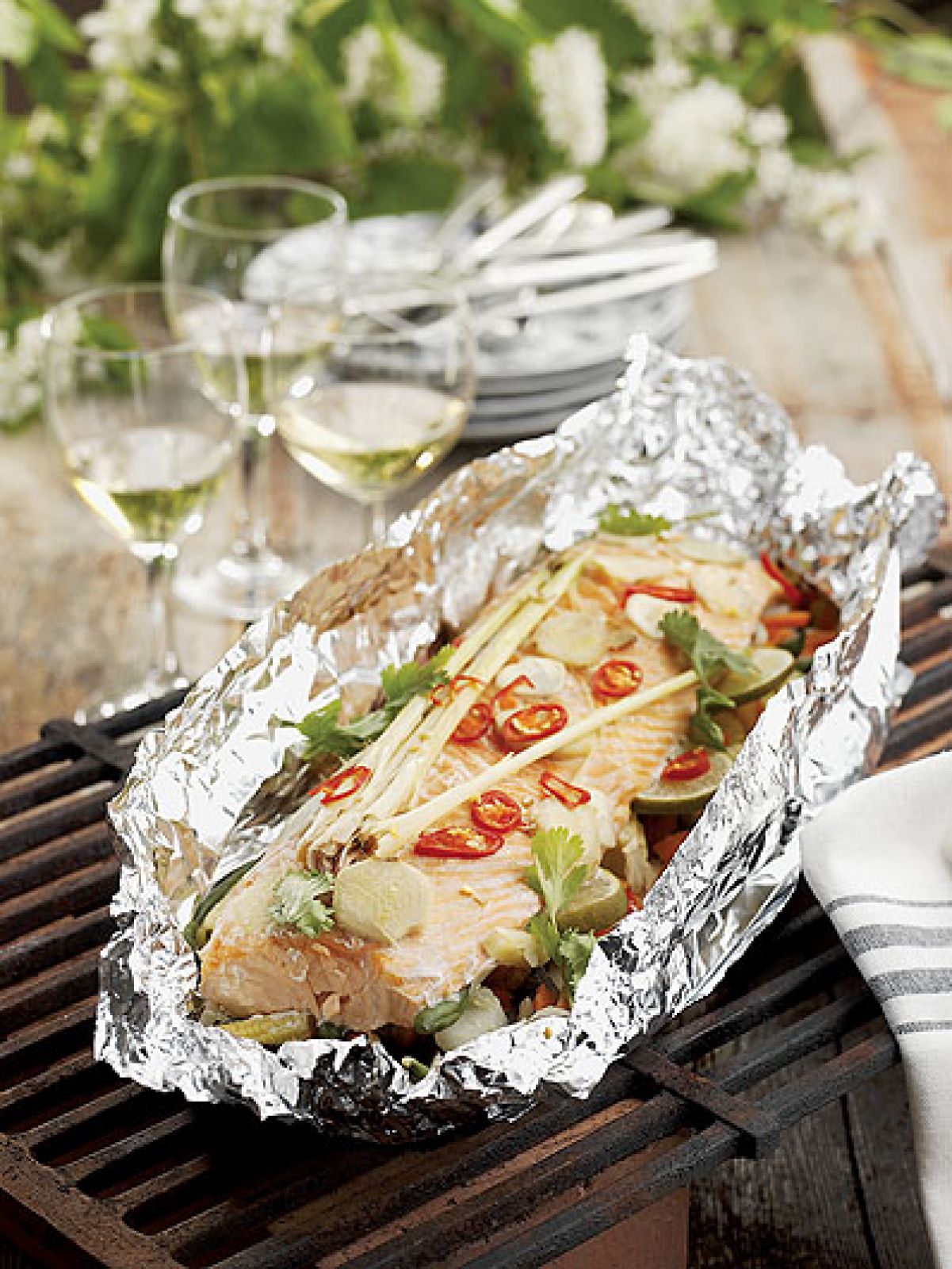 Łososia umyj, osusz, usuń pęsetą resztki ości. Limonki, chili i imbir pokrój w plasterki, groszek oczyść, paprykę pokrój w kostkę, kasztany osącz z płynu. Trawę cytrynową połóż na desce do krojenia i zmiażdż wałkiem. Weź duży kawałek folii aluminiowej, złóż na pół, żeby podczas pieczenia nie pękła. Na środku połóż groszek, paprykę, kasztany, kukurydzę, limonkę i czosnek. Skrop białym winem. Na warzywach połóż posoloną rybę skropioną olejem sezamowym. Na wierzch wrzuć chili, imbir i trawę cytrynową. Polej resztą wina i zawiń szczelnie folią, uważając, żeby wino nie wypłynęło. Piecz na grillu około 20 minut. Zdejmij, rozetnij folię, posyp filety posiekaną kolendrą.