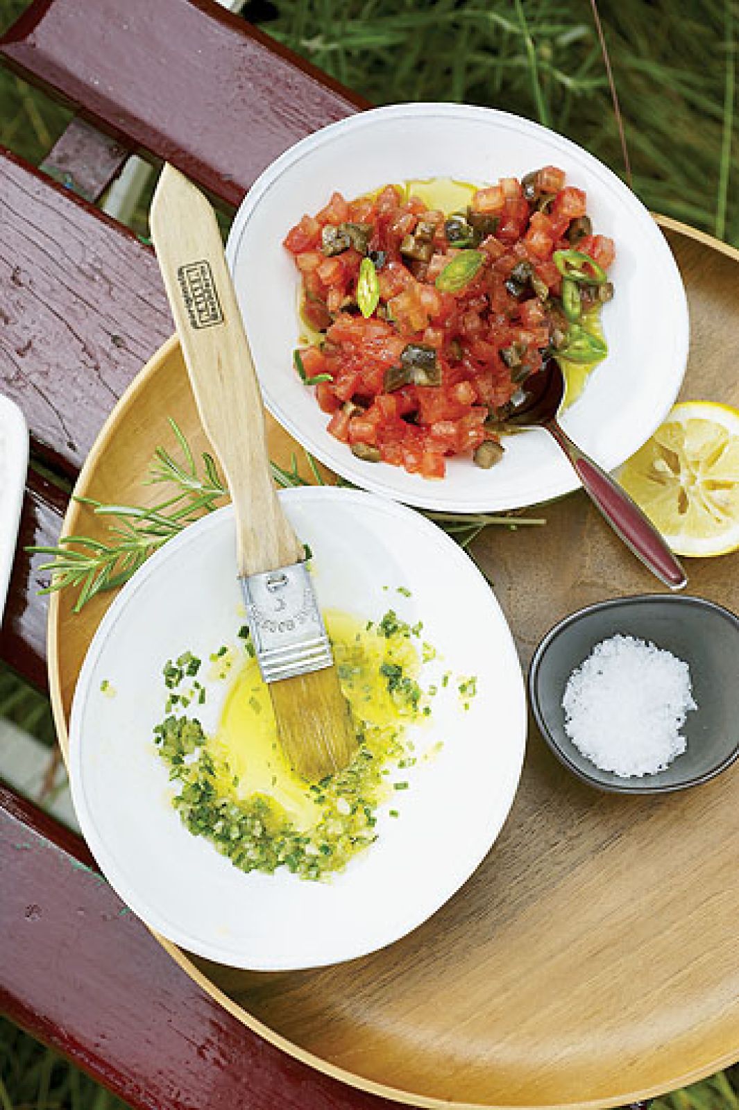 Pomidory natnij i wstaw do rozgrzanego do 200°C piekarnika na 10 minut, aż skórka sczernieje i zacznie odchodzić. Wyjmij, ostudź, obierz i pokrój w drobną kostkę. Oliwki i papryczkę chili posiekaj, wymieszaj z pomidorami. Dodaj oliwę i sok z cytryny, dopraw, wymieszaj. Wstaw do lodówki na pół godziny. Podawaj do pieczonego mięsa.