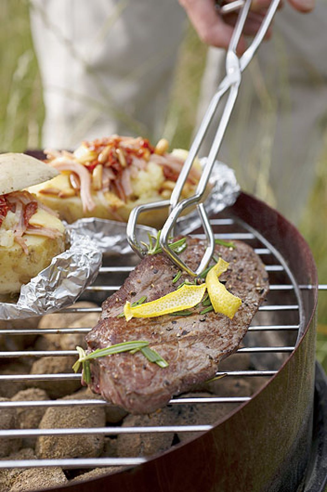 Czosnek rozgnieć, skórkę cytryny drobno posiekaj, rozmaryn podrzyj, wymieszaj z oliwą, pieprzem i sosem sojowym. Zalej mięso i odstaw na kilka godzin do lodówki. Wyjmij, oczyść z marynaty i piecz na mocno rozgrzanym grillu minutę-dwie z każdej strony lub dłużej, jeśli ma być dobrze wysmażony. Wcześniej zrób sos: w garnuszku zagotuj bulion, wlej śmietankę i wrzucaj pokruszony ser, cały czas mieszając. Gotuj kilka minut, aż sos zgęstnieje. Gorące steki rozłóż na talerze, polej sosem. Podawaj z pieczonym ziemniakiem i sałatą.