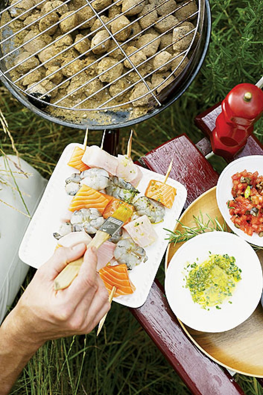 Rybę pokrój w sporą kostkę, krewetki w kawałki, skrop sokiem z połówki cytryny i odstaw na kwadrans. Szczypiorek, czosnek, rozmaryn drobno posiekaj, wymieszaj z oliwą i dopraw. Na patyczki do szaszłyków nadziewaj na przemian kawałki ryby i krewetki. Skrop ziołową oliwą i grilluj po 4 minuty z każdej strony. Skrop sokiem z cytryny.
