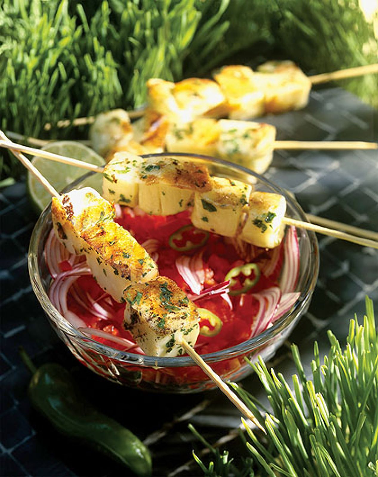Szaszłyki z sera haloumi z sałatką pomidorową