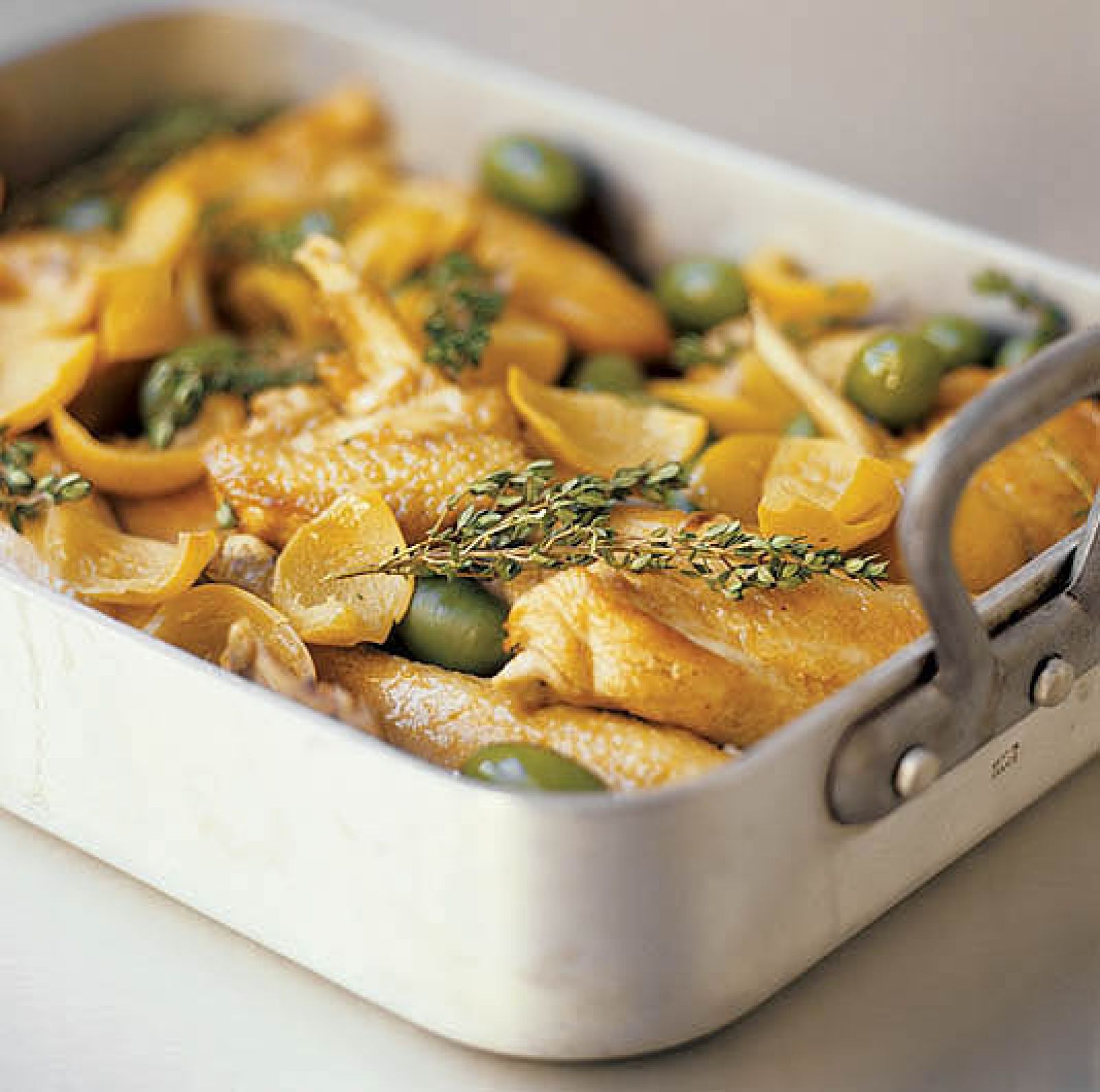 Kurczaka podziel na porcje, cytryny sparz, a następnie pokrój na plastry. Szalotki obierz i pokrój na kawałki. Gałązki ziół podziel na kilkucentymetrowe kawałki. Do żaroodpornego naczynia włóż kurczaka, cytryny i szalotki, posyp ziołami oraz papryką. Wymieszaj w miseczce bulion z przecierem i octem balsamicznym. Polej kurczaka, odstaw na dwie godziny. Włóż do piekarnika rozgrzanego do 180ºC i piecz 50 minut, aż mięso się zrumieni. Podawaj z pieczonymi ziemniakami.
