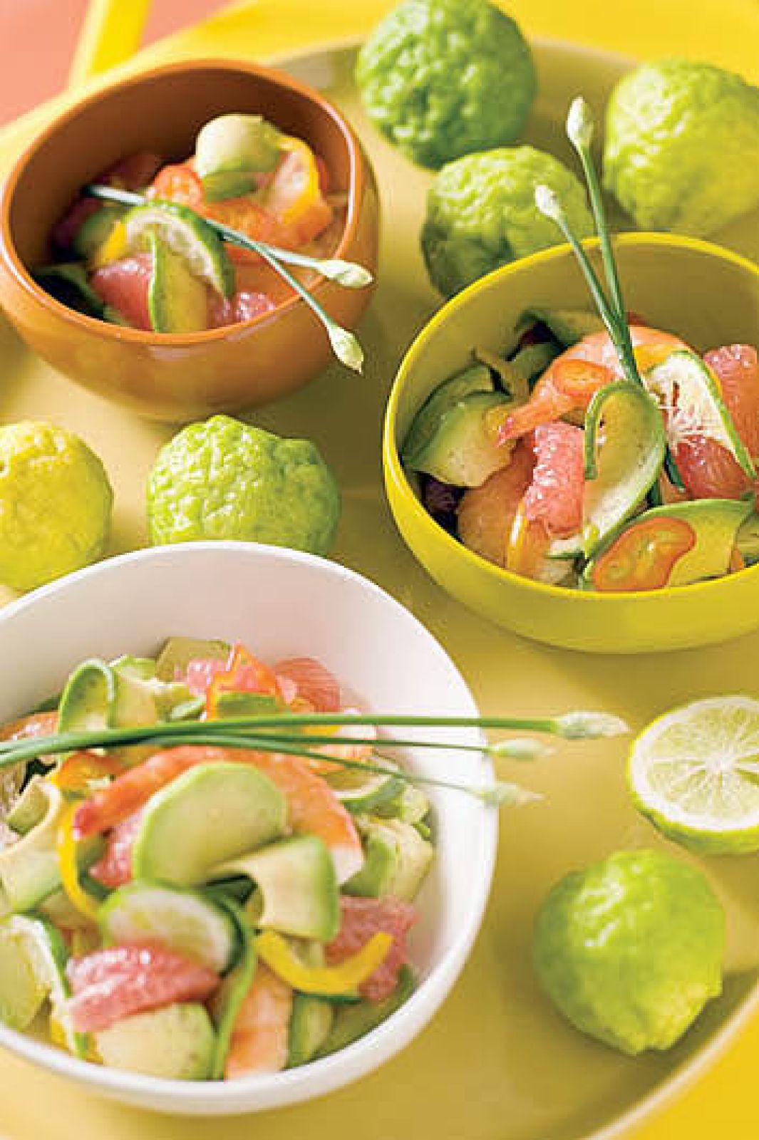 Awokado obierz, wyjmij pestkę, pokrój w paski. Z krewetek usuń skorupki, grejpfruty obierz, usuń białą skórkę, podziel na cząstki. Paprykę pokrój w cienkie plasterki. Z limonki zetrzyj skórkę, wymieszaj z sosem sojowym i oliwą, dopraw solą, pieprzem i odrobiną soku z limonki. Wrzuć wszystko do miski, polej dressingiem i wymieszaj. Odstaw do lodówki na 20 minut. Udekoruj piórkami szczypiorku i plasterkami limonki.