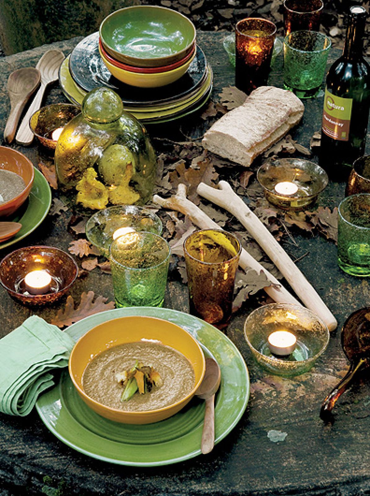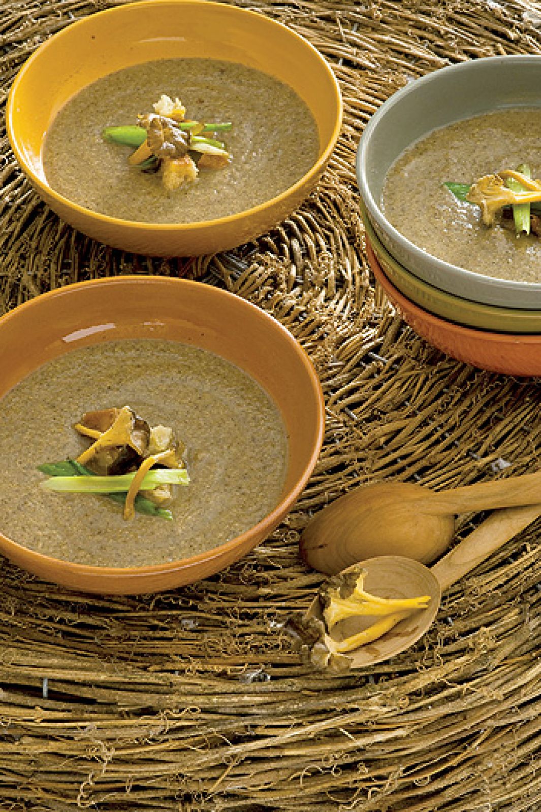 Namocz suszone grzyby we wrzątku, świeże oczyść i pokrój na kawałki. Zostaw garstkę do dekoracji. Zagrzej w garnku oliwę z masłem, wrzuć kurki, szałwię, posiekany czosnek i cebulę. Smaż chwilę, mieszając, dodaj pokrojone suszone borowiki i odsączone kasztany. Wlej litr wrzątku i odcedzoną wodę z moczenia grzybów. Przykryj i gotuj na wolnym ogniu pół godziny. Wyłów liście szałwii, a resztę zmiksuj. Dodaj śmietankę, dopraw solą, pieprzem. Odłożone grzyby przesmaż na oliwie, wrzuć do miseczek, zalej zupą.