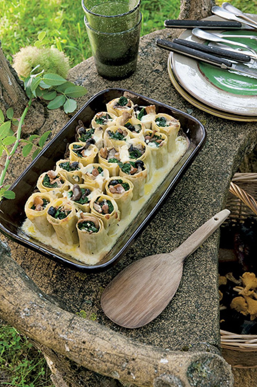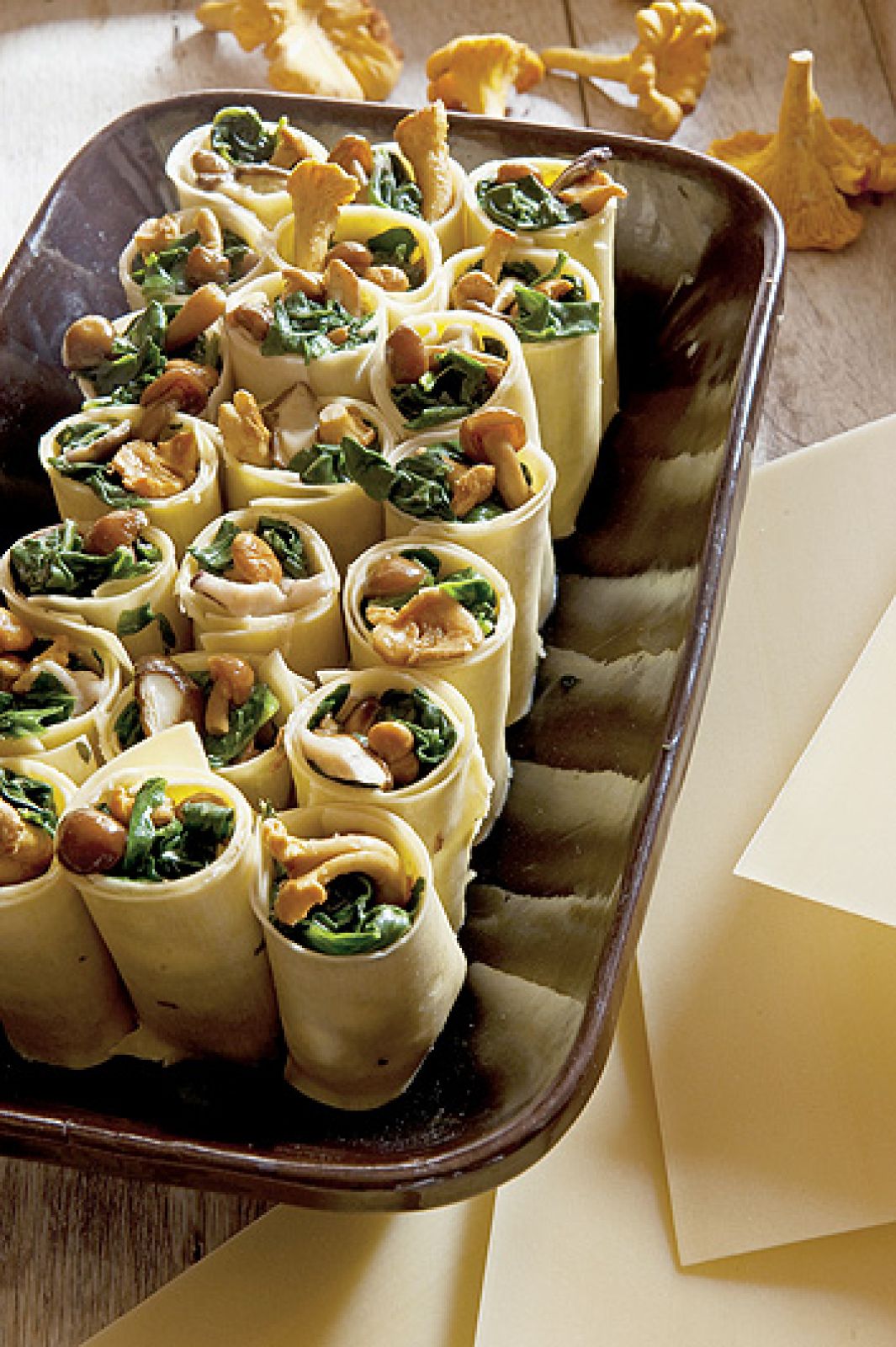 Zagotuj dużo osolonej wody, wrzuć lasagne i ugotuj według instrukcji. Wyłów, ułóż na bawełnianej ściereczce. Szpinak umyj i osusz. Wrzuć na rozgrzaną patelnię i smaż na dużym ogniu 3 minuty, mieszając (powinien zostać jędrny). Na drugiej patelni zagrzej oliwę, dodaj grzyby i duś, aż odparuje z nich woda. Wymieszaj szpinak z grzybami, a mascarpone z parmezanem. Posmaruj serową masą płaty lasagne, na to połóż farsz. Zawiń w rurki i przekrój każdą na trzy części. Ułóż w nasmarowanym masłem naczyniu do zapiekania i wstaw do piekarnika rozgrzanego do 180ºC na 20 minut.
