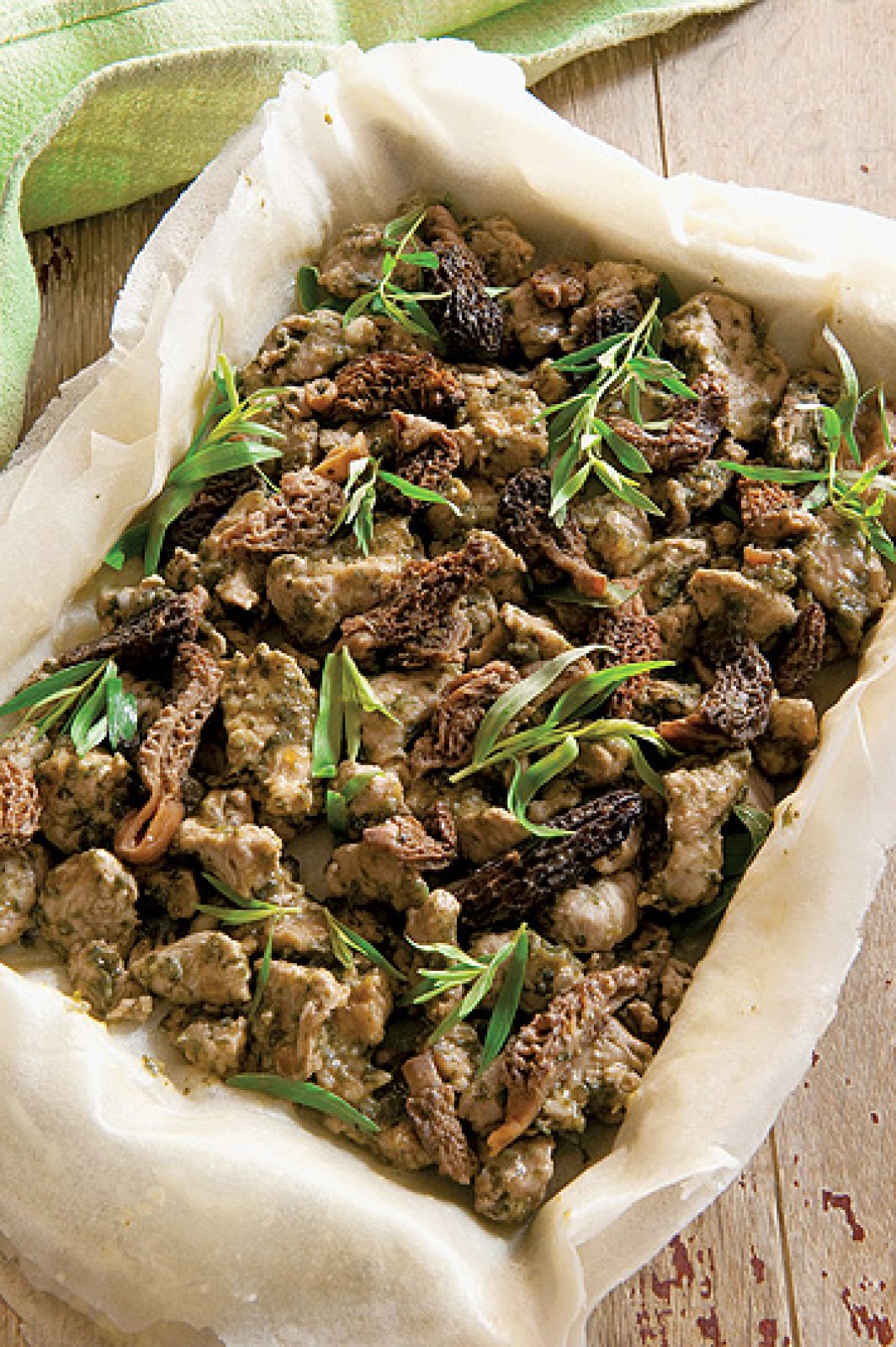 Mięso pokrój w paski, wrzuć na patelnię z łyżką masła i oliwy. Smaż na rumiano. Dodaj grzyby i posiekany estragon, smaż, aż odparuje woda. Wlej śmietanę, gotuj jeszcze 3 minuty. Rozpuść pozostałe masło. W naczyniu do zapiekania rozłóż 6 płatów ciasta filo. Każdy posmaruj masłem, na wierzch połóż farsz, przykryj znów ciastem posmarowanym masłem. Wierzch posmaruj rozkłóconym jajem. Piecz 20 minut w temperaturze 180ºC, aż ciasto będzie złote.