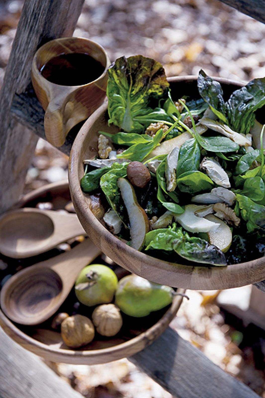 Grzyby pokrój na cieniutkie plasterki, wrzuć do miski, zalej oliwą, dopraw solą oraz pieprzem i odstaw na godzinę. Gruszki obierz, pokrój w cienkie plasterki. Do miski wrzuć umyte listki i kiełki, kawałki gruszki, grzyby oraz orzechy. Zrób dressing, dopraw, polej sałatkę i dokładnie wymieszaj.