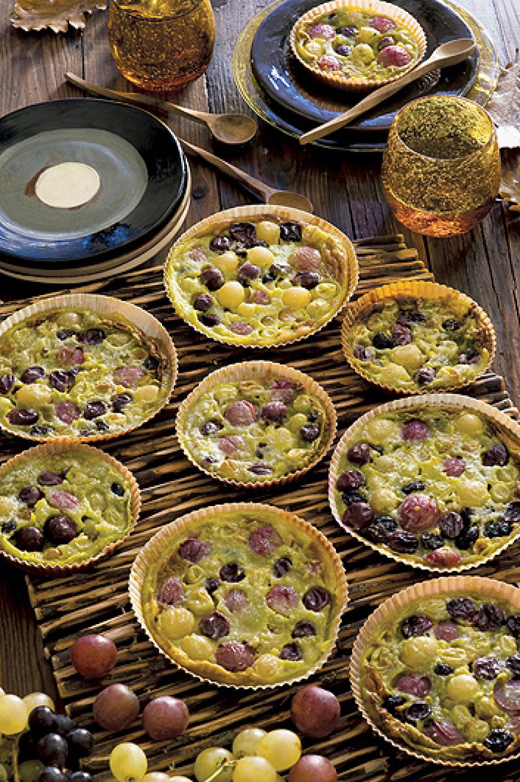 Winogrona przekrój na pół, usuń pestki. Masło rozpuść w garnuszku, zbierz z wierzchu szumowinę. W misce ubij jaja z cukrem, dodaj mąkę oraz migdały i, cały czas ubijając, wlej najpierw śmietankę, a potem stopione i przestudzone masło. Do foremek na babeczki włóż winogrona i zalej masą tak, by nie przykrywała owoców. Piecz 25 minut w piekarniku nagrzanym do 180ºC.
