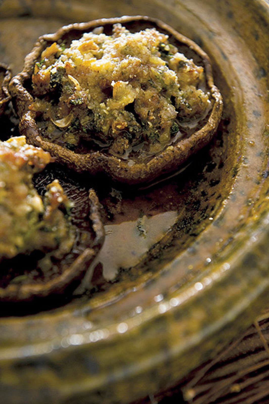 Oczyść kapelusze pieczarek. Odetnij nóżki i pokrój je w drobną kostkę. Czosnek oraz szalotki posiekaj. Chleb zetrzyj na tarce. Rozgrzej oliwę na patelni, wrzuć szalotki i czosnek, smaż minutę. Dodaj nóżki, smaż 3 minuty, mieszając. Wrzuć posiekane anchois, natkę i starty chleb. Smaż chwilę, mieszając. Dopraw, nałóż farsz do kapeluszy, posyp parmezanem, włóż do natłuszczonego naczynia i piecz przez 30 minut w temperaturze 160ºC.
