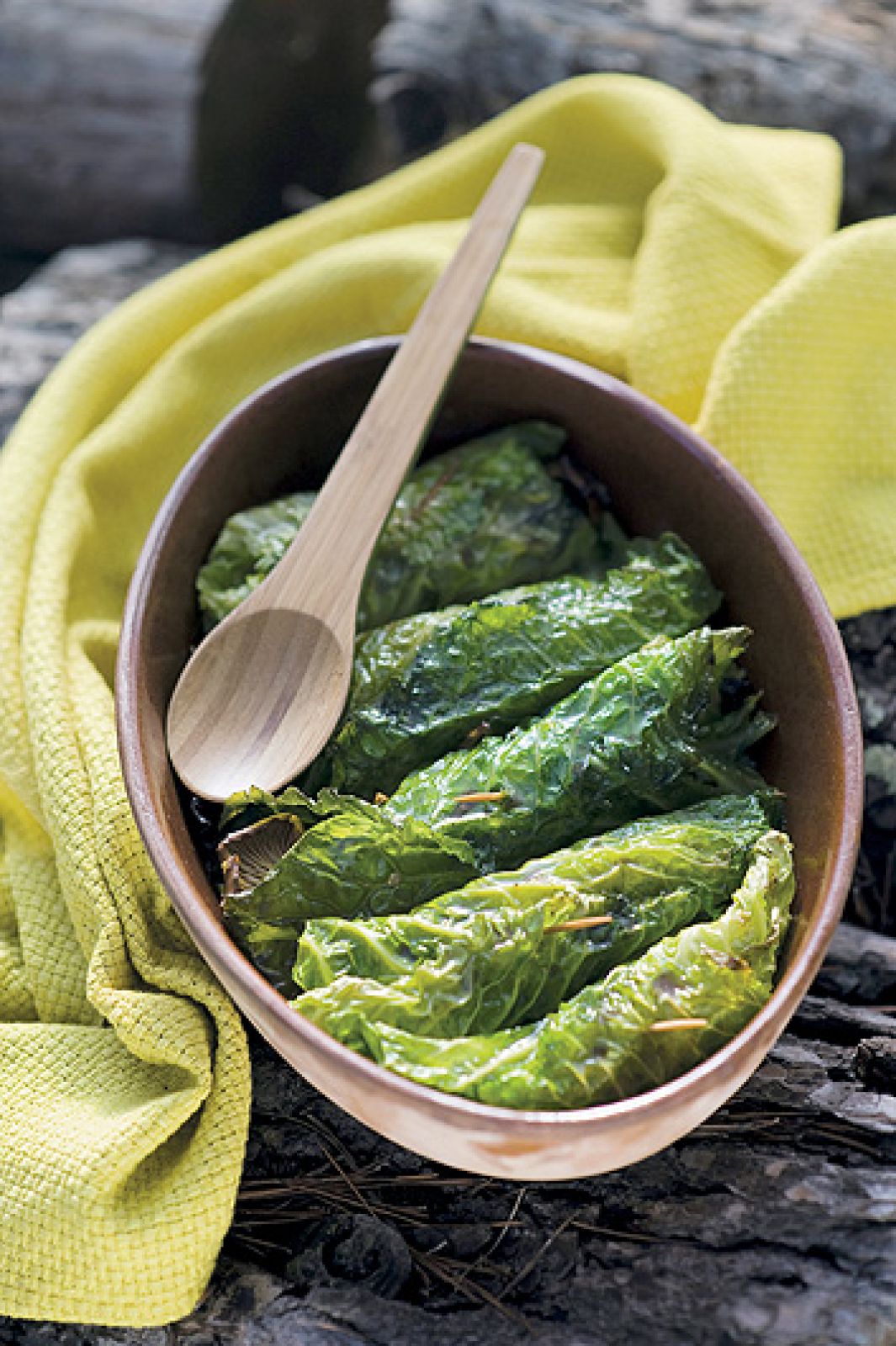 Szalotki, czosnek i natkę posiekaj. Liście kapusty sparz (5 minut) we wrzątku i zanurz w lodowatej wodzie, żeby nie straciły koloru. Rozłóż na ściereczce. Pokrój drobno seler i grzyby. Rozgrzej na patelni łyżkę masła, wrzuć czosnek, szalotkę i smaż chwilę. Dodaj grzyby i seler, smaż jeszcze 3 minuty, mieszając. Wlej łyżkę wody, odparuj, wrzuć do miski razem z jagnięciną i natką. Wymieszaj dokładnie, dopraw. Na każdy liść nakładaj farsz i zawijaj. Ułóż w naczyniu żaroodpornym, polej stopionym masłem. Piecz 20 minut w piekarniku rozgrzanym do 160ºC.