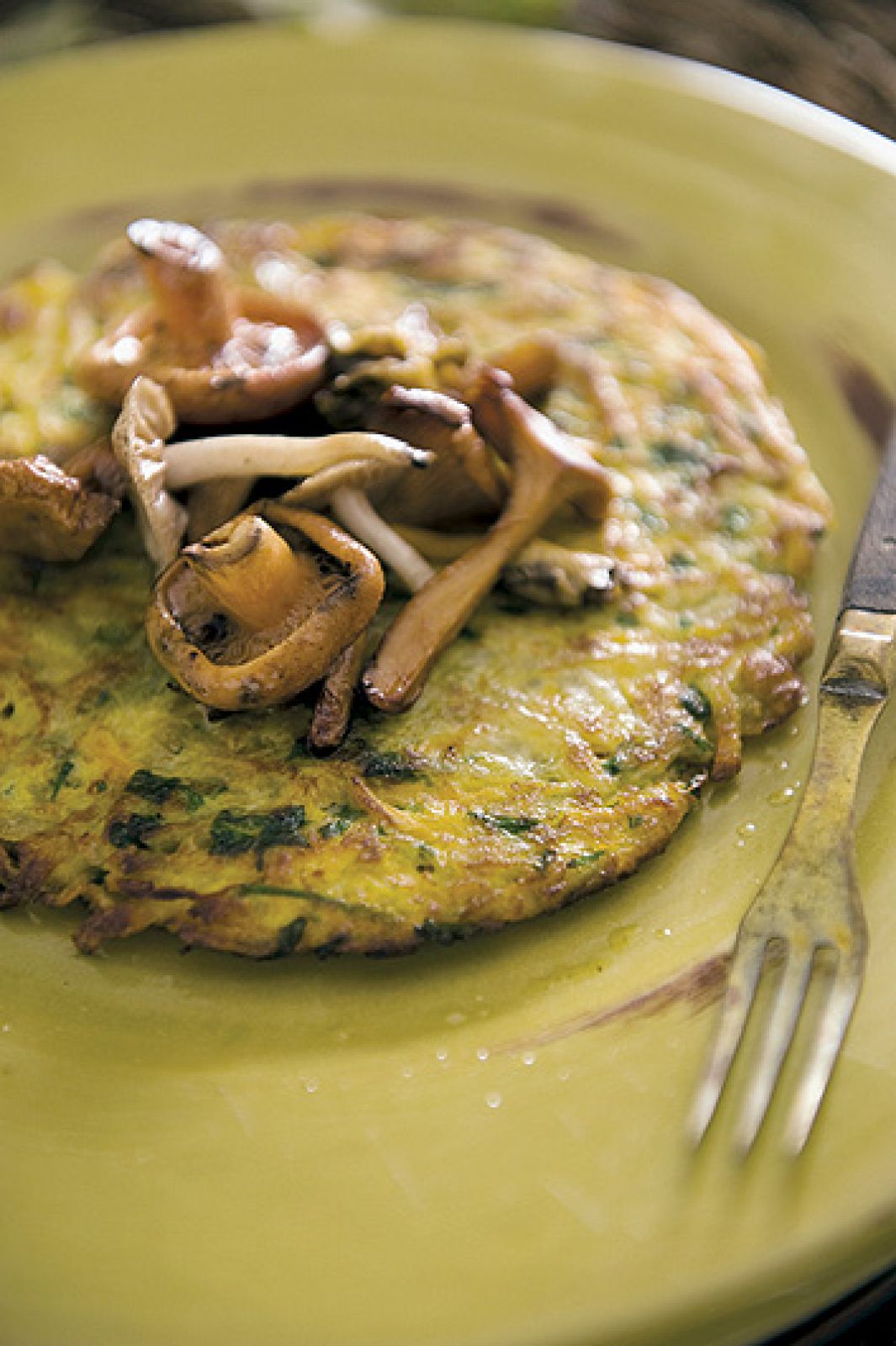 Grzyby oczyść i drobno pokrój. Przesmaż na łyżce masła. Ziemniaki obierz i zetrzyj na tarce, odsącz z wody. Dodaj grzyby, jaja i posiekane zioła. Wymieszaj i dopraw. Rozgrzej pozostały tłuszcz na dużej patelni. Wlej masę ziemniaczaną i smaż na niedużym ogniu przez 10 minut. Odwróć na drugą stronę i smaż również 10 minut. Podawaj z sałatką i młodymi ziemniakami.